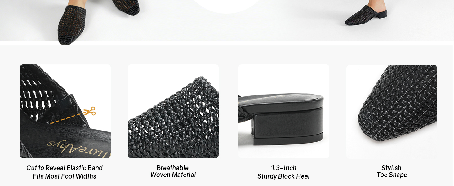 أحذية منخفضة الكعب: تمتع براحة خفيفة الوزن في هذه الأحذية النسائية سهلة الارتداء والتي تتميز بكعب منخفض وتصميم مفتوح عند الأصابع. صُنعت هذه الشرائح باللون الأسود متعدد الاستخدامات، وتتميز بنعل مرن وتصميم سهل الارتداء، مما يجعلها مثالية للنزهات السريعة أو الاسترخاء في الأماكن المغلقة.