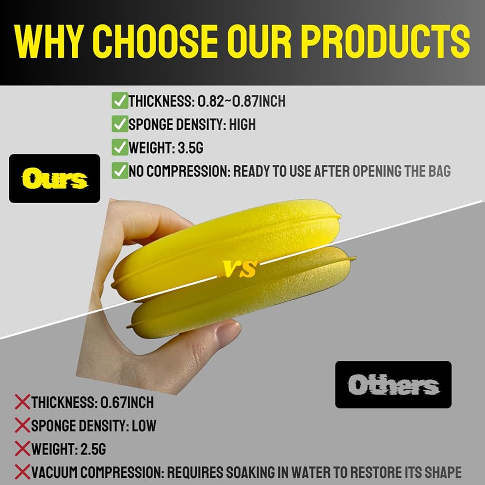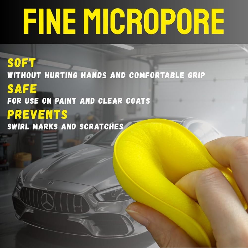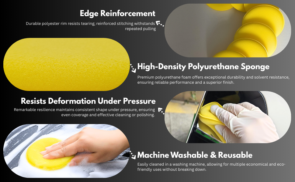 المادة والملمس: إسفنجة ذات كثافة عالية تتميز بمسام موحدة؛ فهو ذو ملمس ناعم ويرتد على الفور عند ضغطه. يحافظ على شكله بعد الغسيل في الغسالة. ملمس ناعم مع حماية قوية لطلاء السيارة؛ يمنع بشكل فعال علامات الدوامة والخدوش.