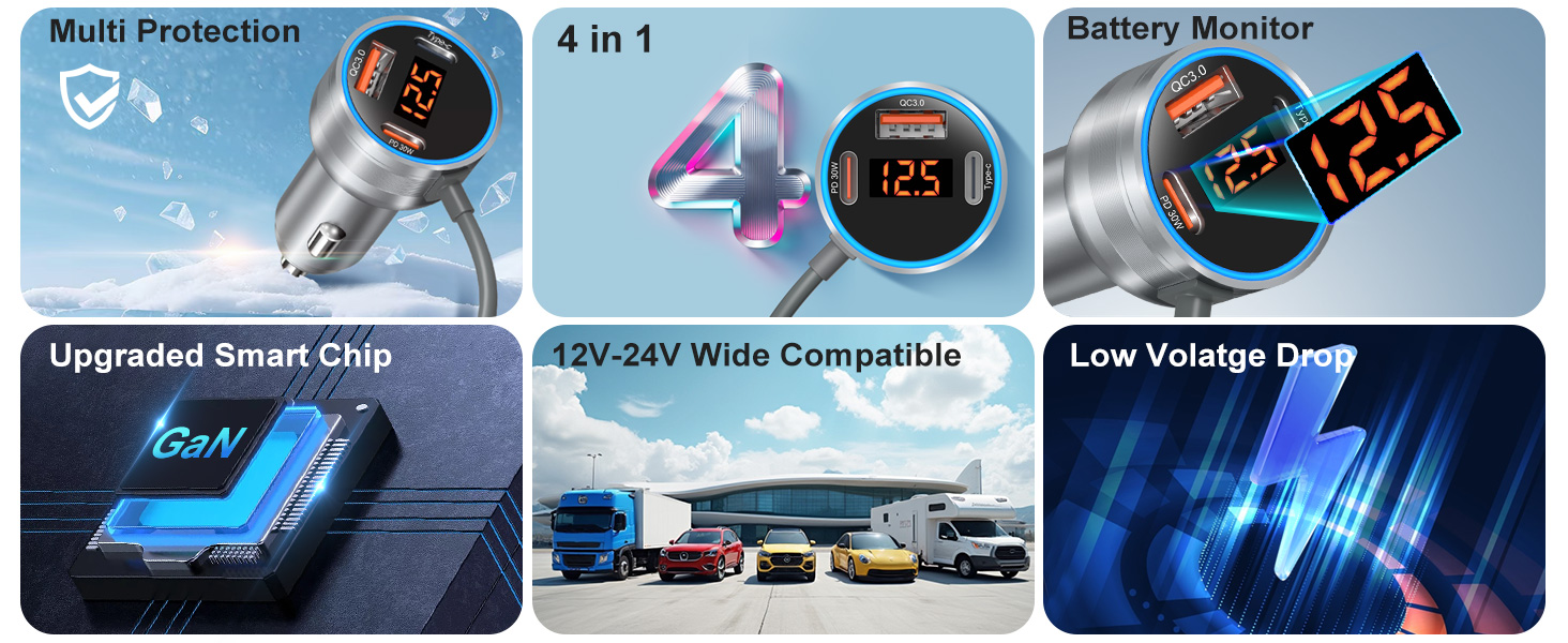 • عرض الجهد الكهربي في الوقت الحقيقي - يجب اقتناؤه لمركباتك: يتميز كل محول سيارة بمقياس فولتميتر رقمي مدمج، مما يساعدك على مراقبة نظام السيارة وصحة البطارية. فقط من خلال نظرة سريعة، يمكنك التحقق من مستوى البطارية في أي وقت لتجنب الشحن الزائد، خاصة في أيام الصيف الحارة.