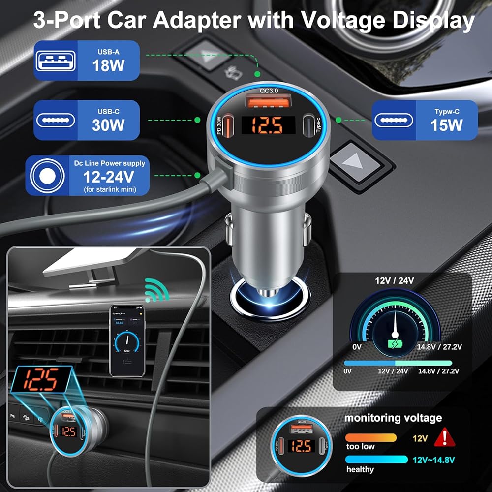 • شاحن سيارة Starlink Mini 4 في 1: مقبس ولاعة سجائر 12 فولت يتميز بمنافذ USB-C وUSB-A للسيارة، مما يسمح لك بشحن أجهزة متعددة في وقت واحد مع تشغيل Starlink Mini أيضًا. يمكن لمنفذ USB-C PD 30W الشحن بسرعة فائقة لمعظم الأجهزة المطلوبة ذات الطاقة العالية. يمكن لمنفذ USB-A QC 18W الشحن السريع لأجهزة samung وأجهزة Android الأخرى. يمكن استخدام منفذ USB الإضافي لشحن الأجهزة الأقل طاقة، مثل كاميرا أجهزة القياس أو مراوح USB أو غيرها.