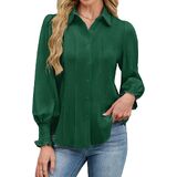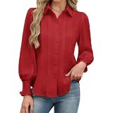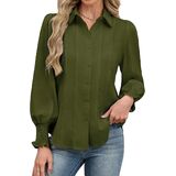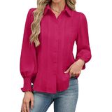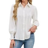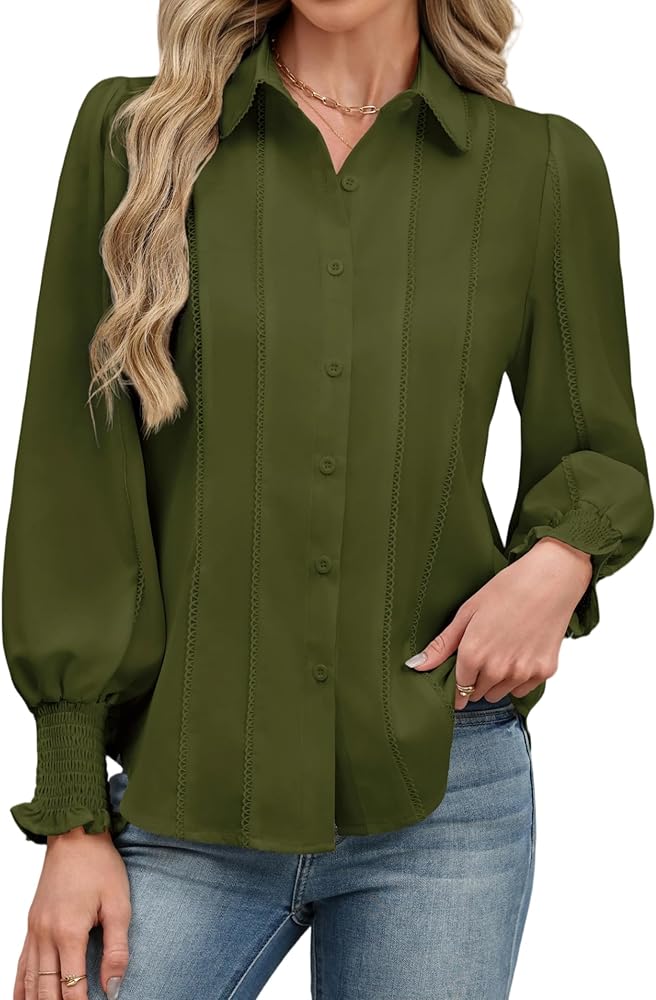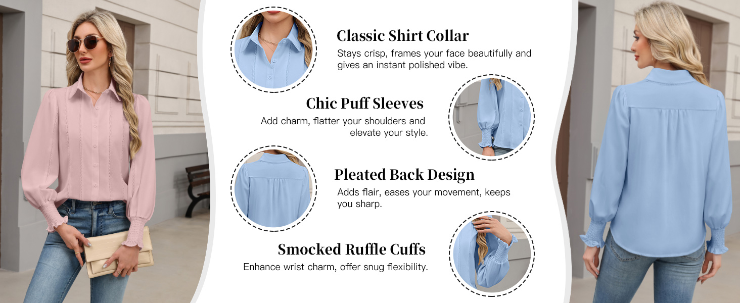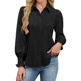 • Features: Classic collared chiffon button down shirts for women trendy, elegant exquisite embroidered trim, long sleeve blouses with elasticated smocked cuffed,pleated design on the back, solid color puff sleeves tops, flowy curved hem, loose fit