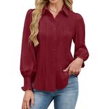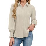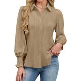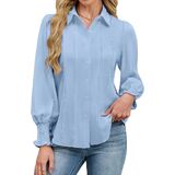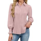 women's long sleeve lightweight boyfriend elastic smocked cuffed pleated collared button down shirts professional soft flowy chiffon work office v neck blouses elegant puff sleeve 2026 trendy dressy business casual office loose fashion ladies going out nice cute formal classy wrinkle free fall boutique embroidered tops