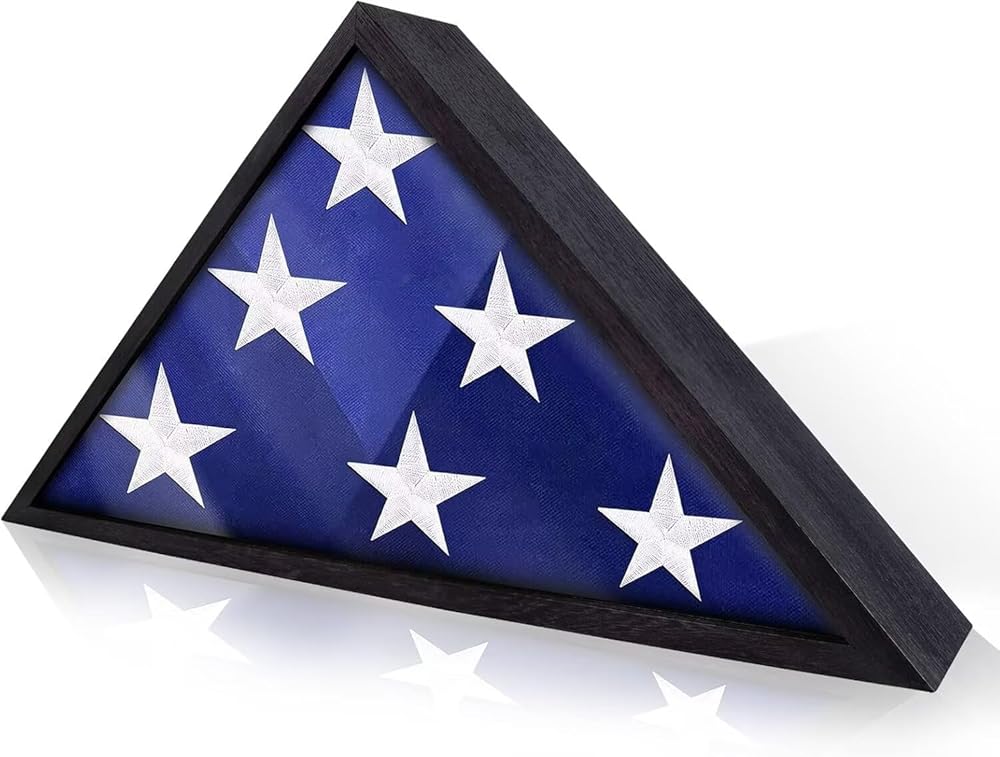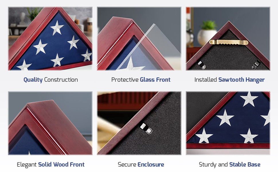 اعرض علمك بفخر: قم بحماية وعرض أعلامك الثمينة مع حقيبة عرض العلم الأنيقة هذه. لمسة نهائية من خشب الجوز الأسود المضاد للبهتان مع زجاج مقسى عالي الدقة يمكن رؤيتها بوضوح لرؤية العلم بالداخل، وغطاء آمن يمنع الغبار والحطام، ويناسب أعلام الدفن الأمريكية ذات الحجم القياسي.