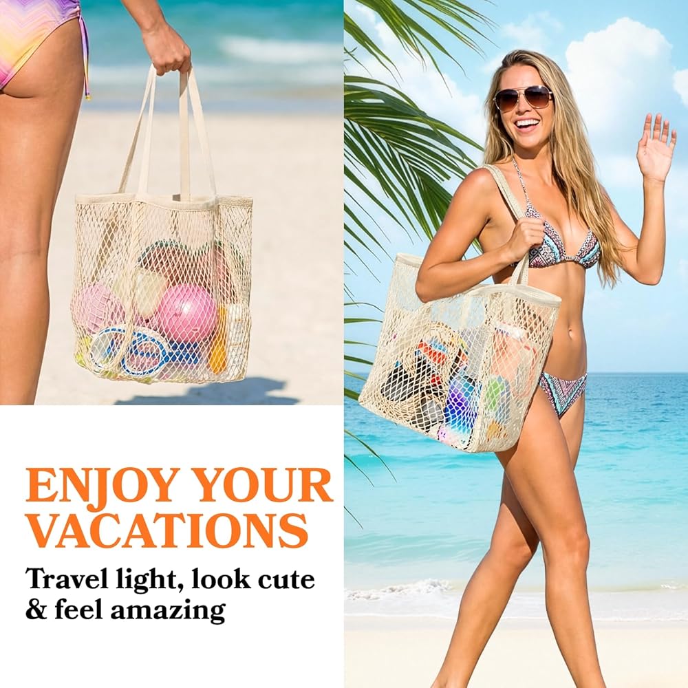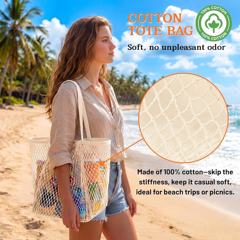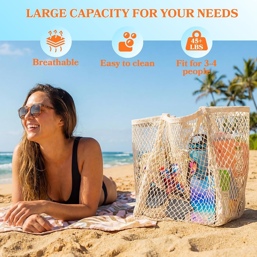 【ناعمة وعديمة الرائحة】حقيبة الشاطئ الشبكية الخاصة بنا مصنوعة من مادة القطن بنسبة 100%، ناعمة وعديمة الرائحة. تصميم شبكي مسامي يمنع تراكم الرمال. يمكن غسلها في الغسالة وتجفيفها بسرعة، مما يجعل العناية بها سهلة للغاية، ويمكنها حمل ما يزيد عن 45 رطلاً، وتحمل جميع ضرورياتك بسهولة.