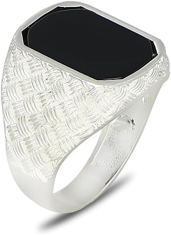 خاتم رجالي من حجر العقيق الصلب المطلي بالفضة – خاتم الخاتم من حجر العقيق المستطيل | جوانب بنمط الحياكة، مجوهرات عصرية للرجال من الفولاذ المقاوم للصدأ المتين