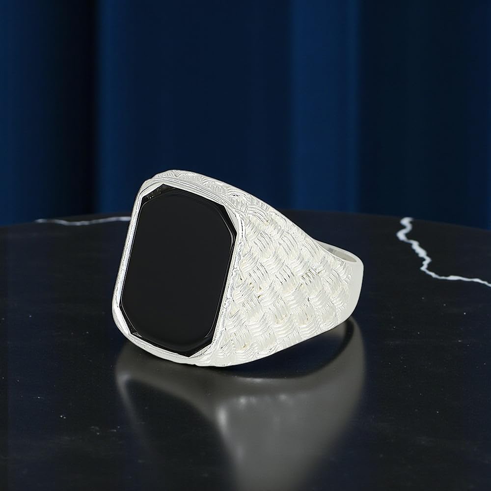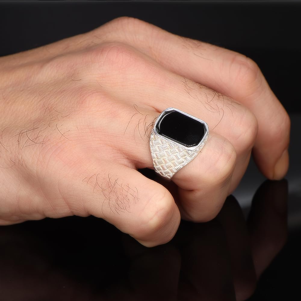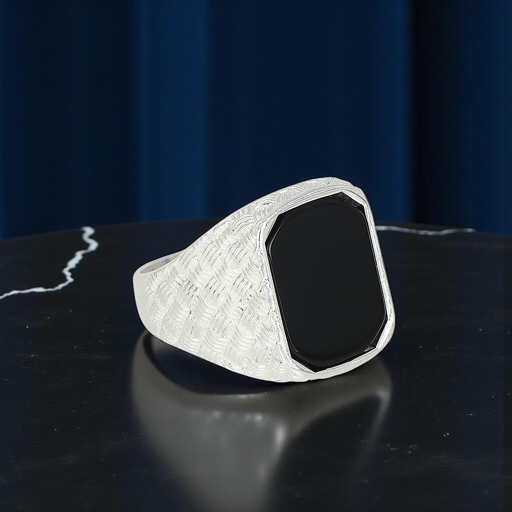 Add a bold and earthy touch to your style with this Premium Silver-Plated Steel Men's Ring, featuring a polished rectangle onyx stone. Known for its black shimmer, onyx brings a natural, powerful presence to any outfit. The ring is crafted with a durable stainless-steel base and premium silver plating, paired with knitting pattern sides that create a handcrafted, textured look. A perfect combination of strength, elegance, and masculine design—ideal for daily wear and gifting. Made in Turkiye