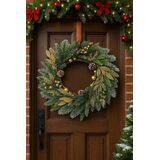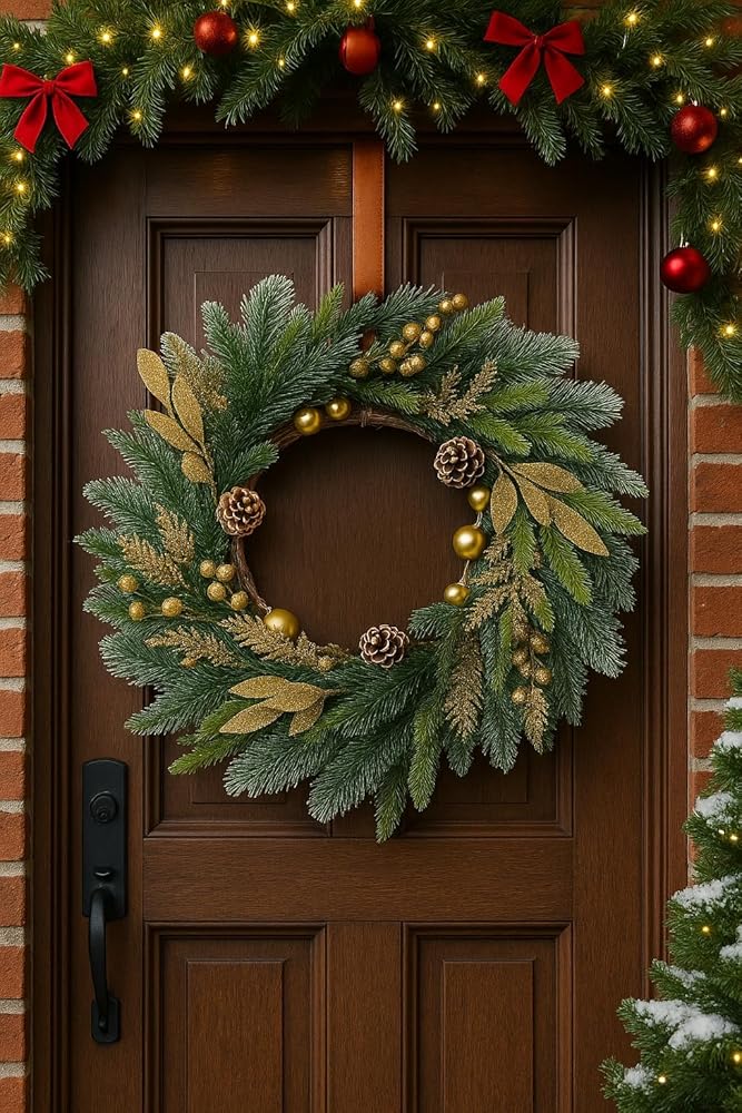 The gold accents catch the light just right and create a lovely shimmer both day and night. I really appreciate how well-balanced the design is—lush on one side with a natural flow, so it doesn't look too uniform or fake. The materials feel sturdy, and the wreath is lightweight enough to hang easily without slipping. It looks great on glass doors too, like mine, and holds up well indoors or in a covered outdoor space. Pros: Realistic pine and pinecone design Elegant gold accents and ornaments Lightweight and easy to hang Full, balanced look Durable and reusable year after year