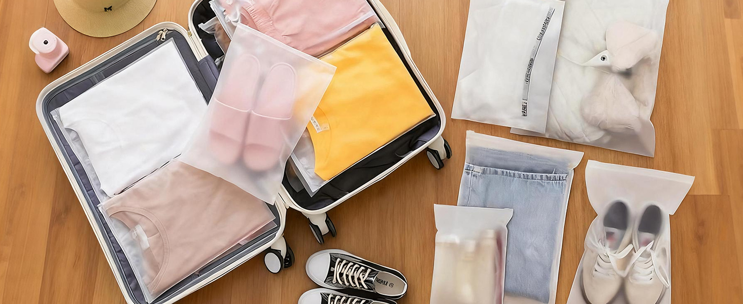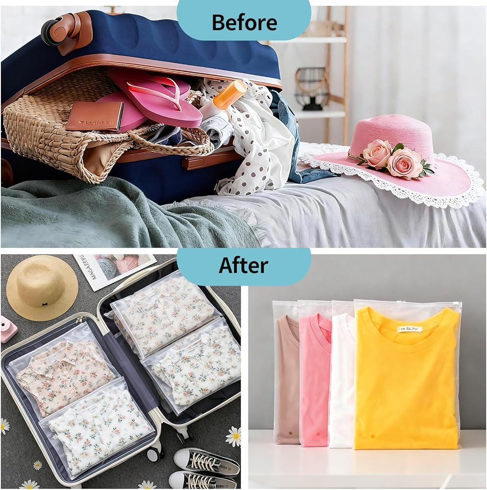【العبوة والمقاس】: تتضمن العبوة إجمالي 30 قطعة من أكياس التعبئة البلاستيكية، تحتوي على 5 مقاسات مختلفة: 40*50 سم، 35*45 سم، 30*40 سم، 20*30 سم، 17*25 سم، و6 قطع/مقاس، حل مثالي لمشكلة تخزين أحجام مختلفة من الأمتعة أو مستلزمات السفر.