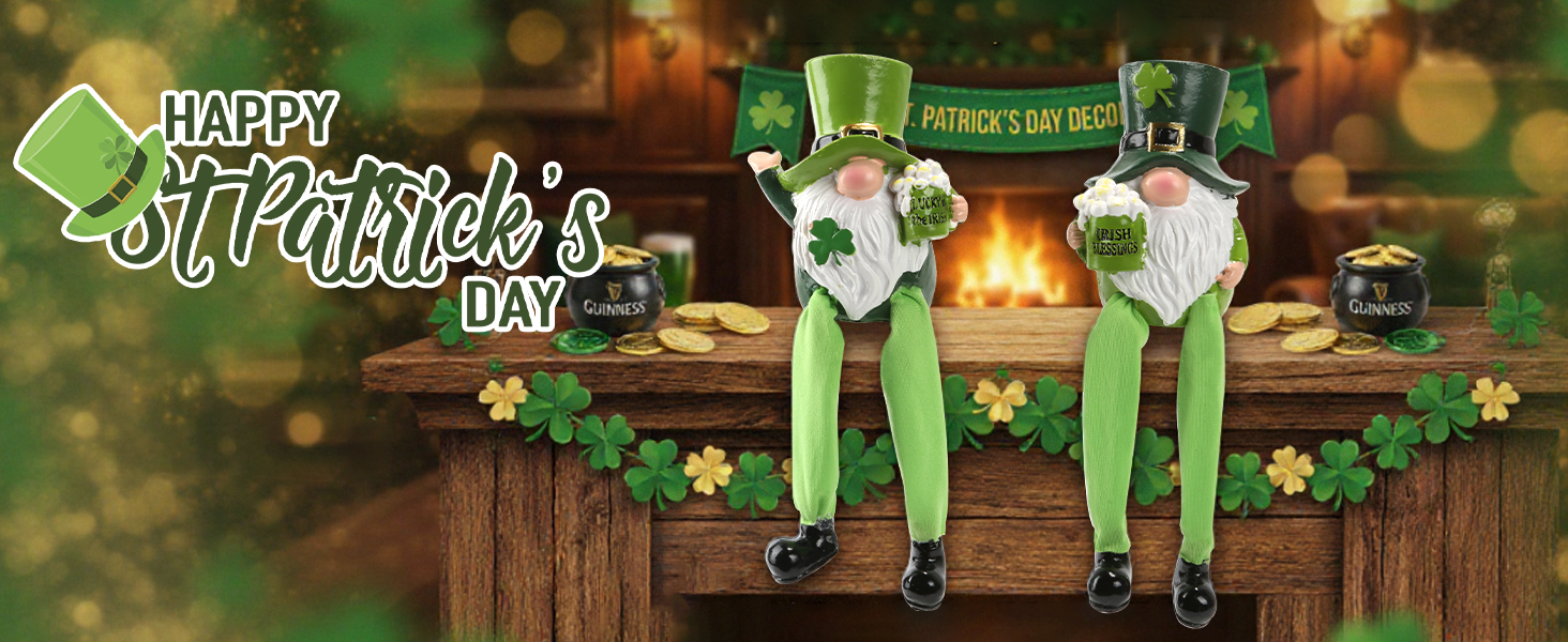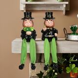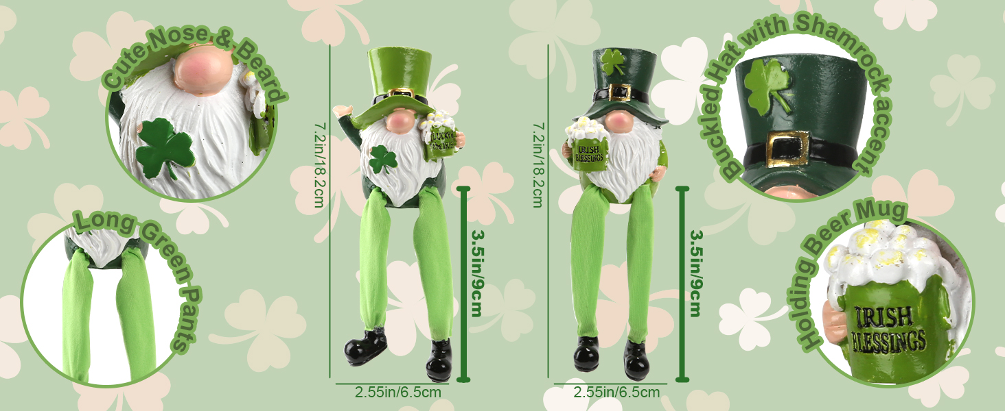 🍀 مجموعة تماثيل سيتر على رف عيد القديس باتريك - تتميز بتمثالين جنوم احتفاليين بأرجل متدلية، تحمل أكواب ذات طابع أيرلندي من أجل عرض مرح ومبهج في عيد القديس باتريك.