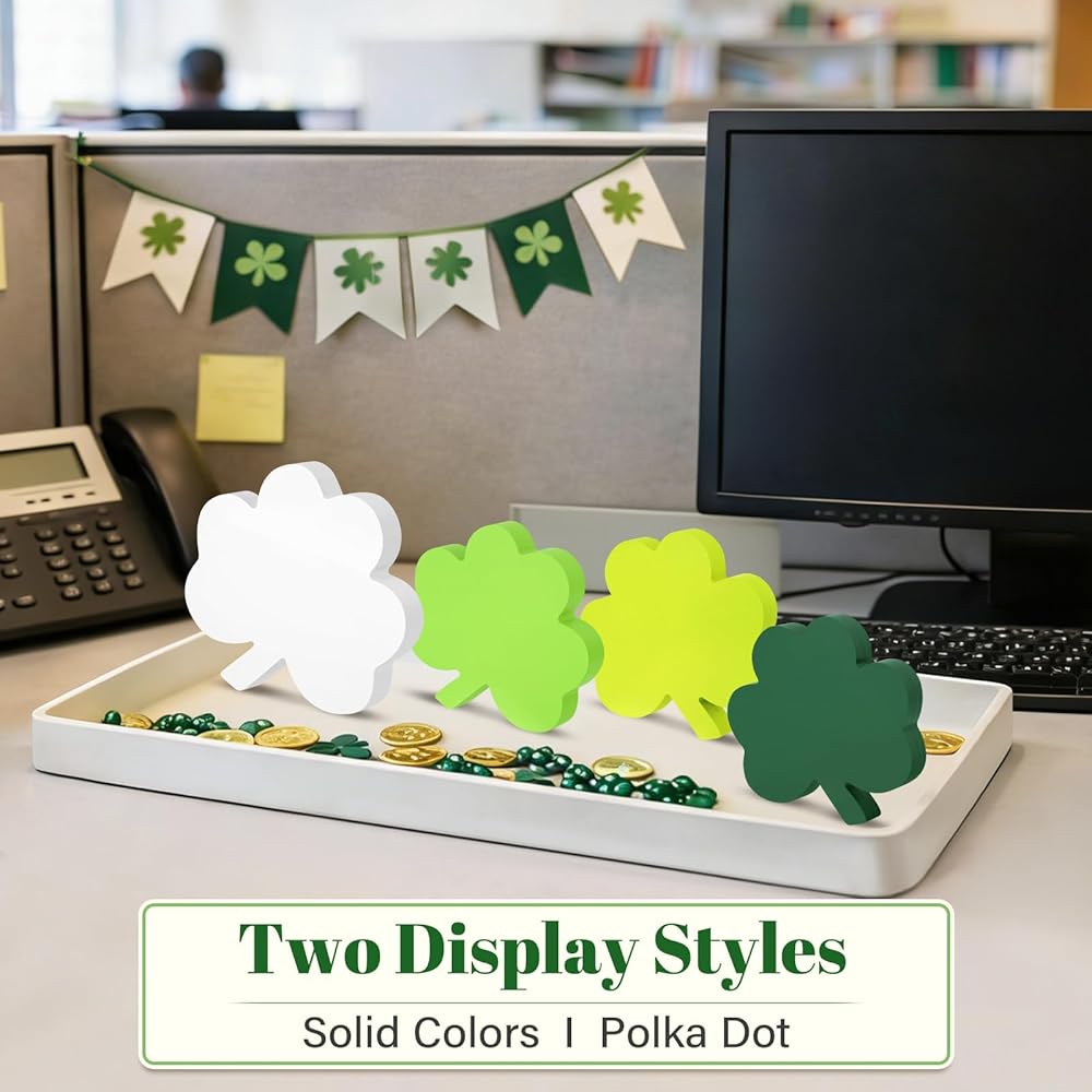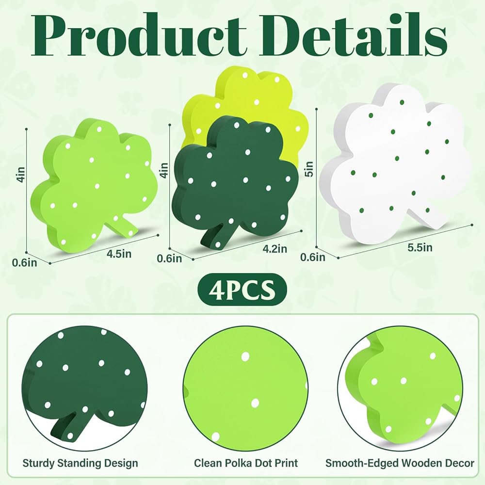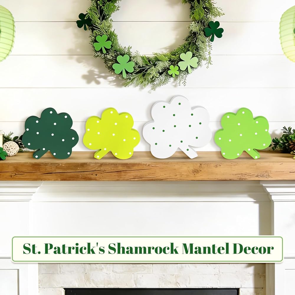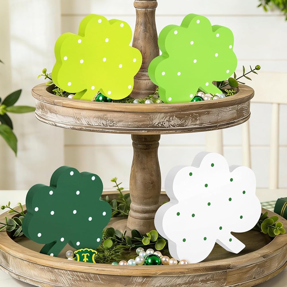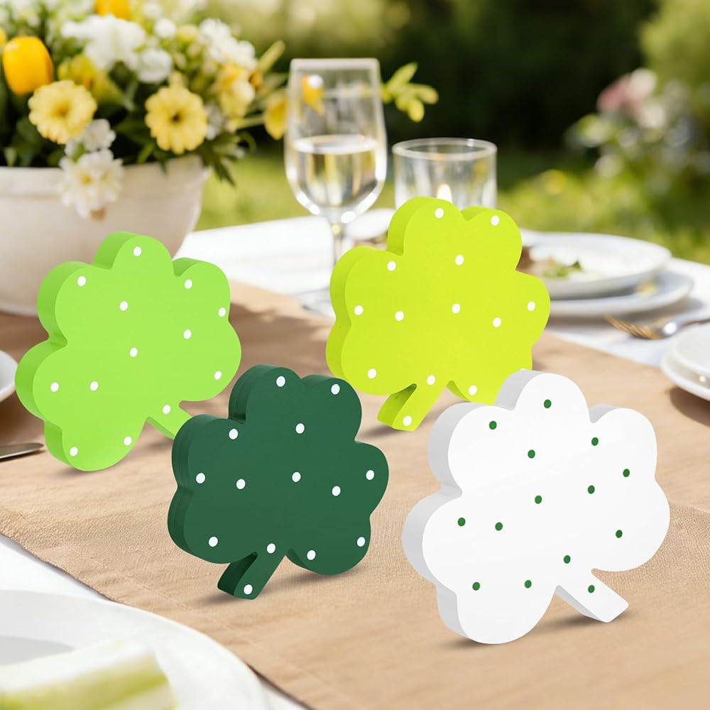 ديكور طاولة شامروك لعيد القديس باتريك: تم تصميم مجموعة ديكور شامروك الخشبية المكونة من 4 قطع لتوضع مباشرة على الطاولات أو الصواني، مما يوفر لك الوقت والجهد مع إنشاء مظهر منسق لديكور عيد القديس باتريك على الفور