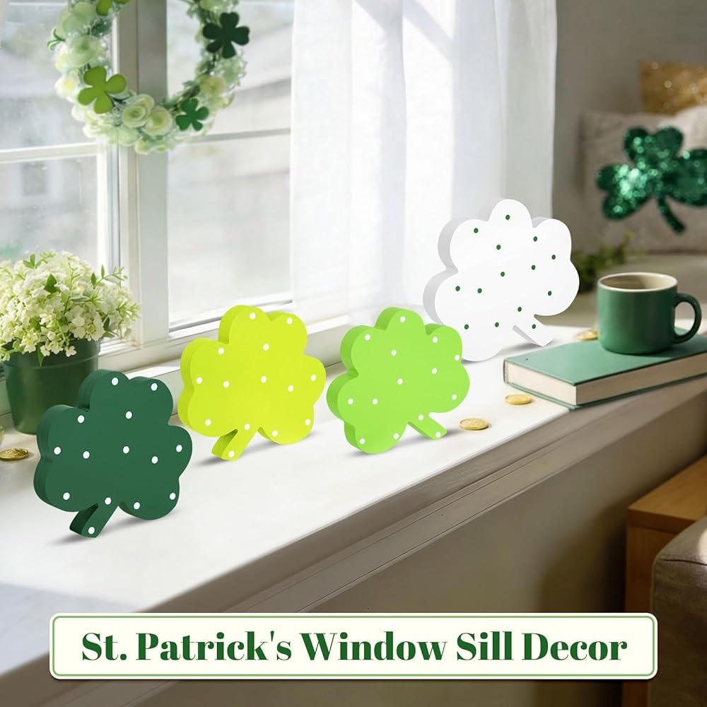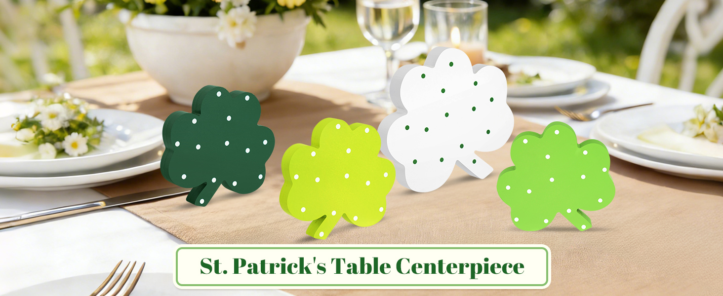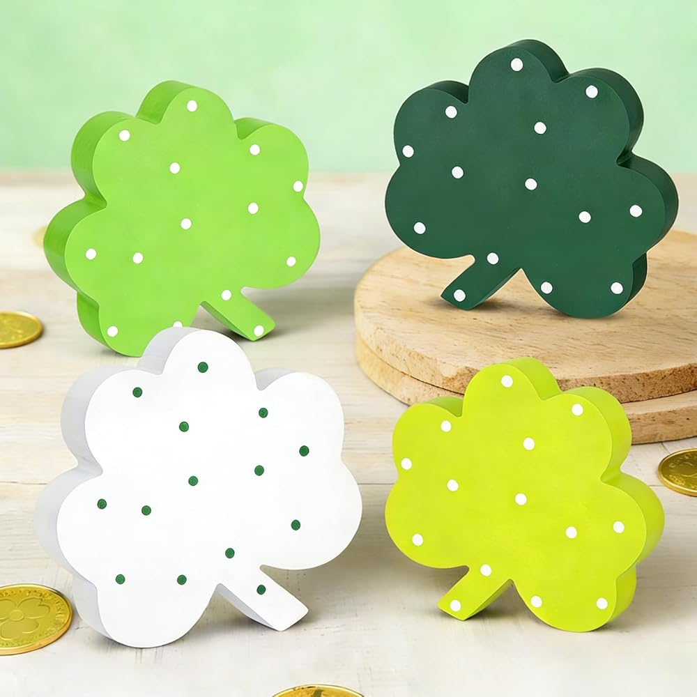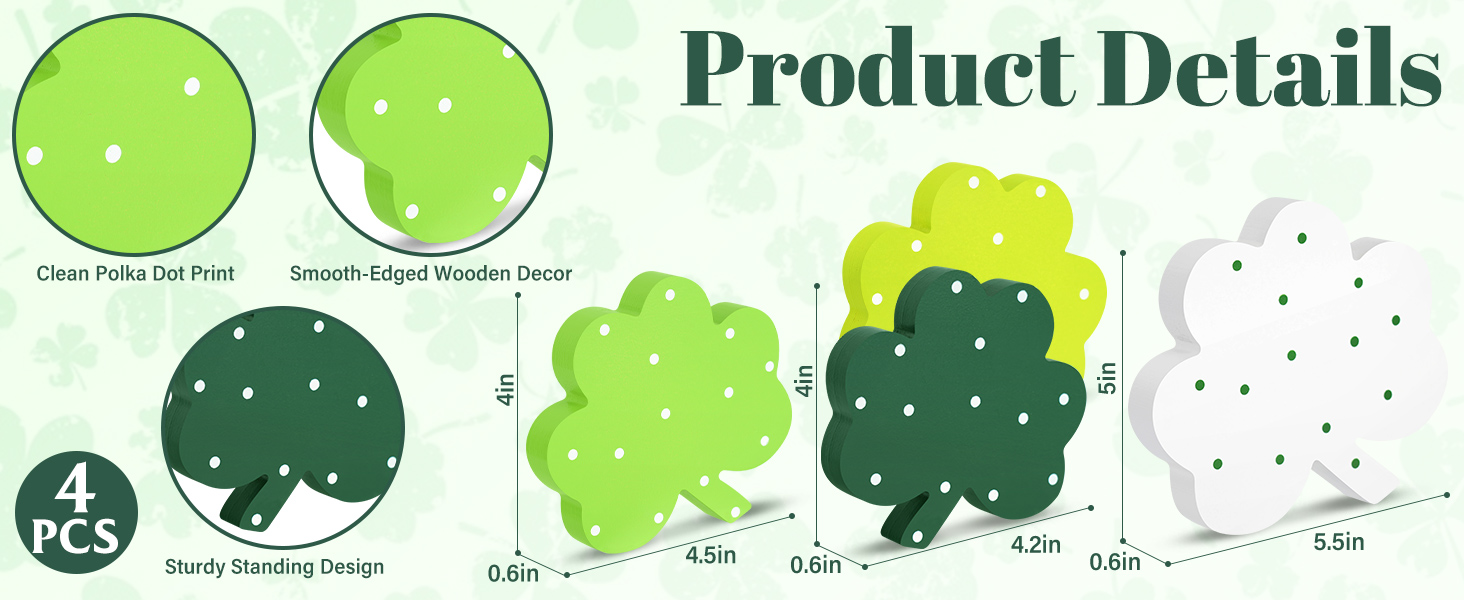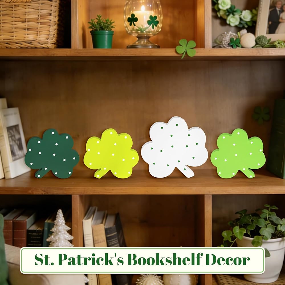 ديكور طاولة شامروك لعيد القديس باتريك: تم تصميم مجموعة ديكور شامروك الخشبية المكونة من 4 قطع لتوضع مباشرة على الطاولات أو الصواني، مما يوفر لك الوقت والجهد مع إنشاء مظهر منسق لديكور عيد القديس باتريك على الفور