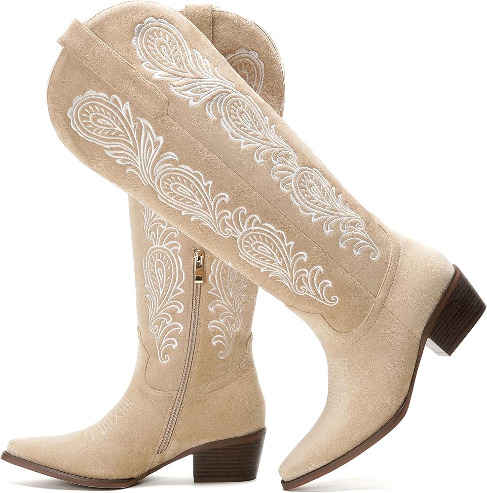 أحذية راعية البقر الغربية من جلد الغزال: أحذية طويلة حتى الركبة باللون البيج تتميز بزخارف مزدوجة فريدة من نوعها - تطريز أبيض معقد مع تطريز صبار غريب الأطوار لمزيج مرح من سحر البوهو الغربي والصحراوي الكلاسيكي.