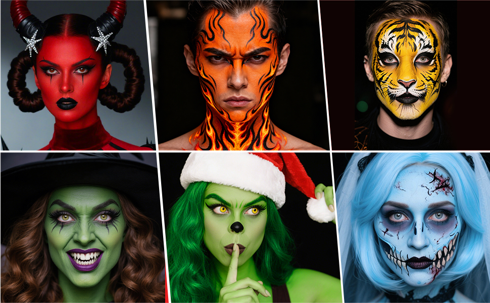 [تطبيق متعدد الاستخدامات لشخصيات وموضوعات متعددة] مجموعتنا الواسعة من ظلال الألوان النابضة بالحياة، تفتح إمكانات إبداعية لا حدود لها لمجموعة واسعة من المواضيع والمناسبات. بدءًا من مصاصي الدماء أو الشياطين الكلاسيكيين (باستخدام اللون الأحمر الداكن/الأسود) وحتى الخيال بالنسبة إلى الصور الرمزية أو الغامض بالنسبة للساحرات (الأزرق الفاتح/الأخضر)، يمكن تحقيق ذلك بسهولة. مثالية لحفلات الهالوين، ومكياج المسرح، والحفلات ذات الطابع الخاص، وفنون الجسم الاحتفالية، والتصوير الفوتوغرافي SFX.