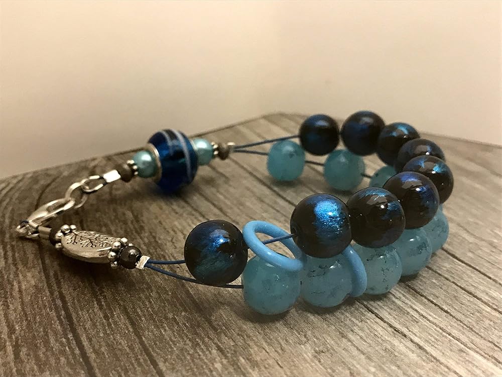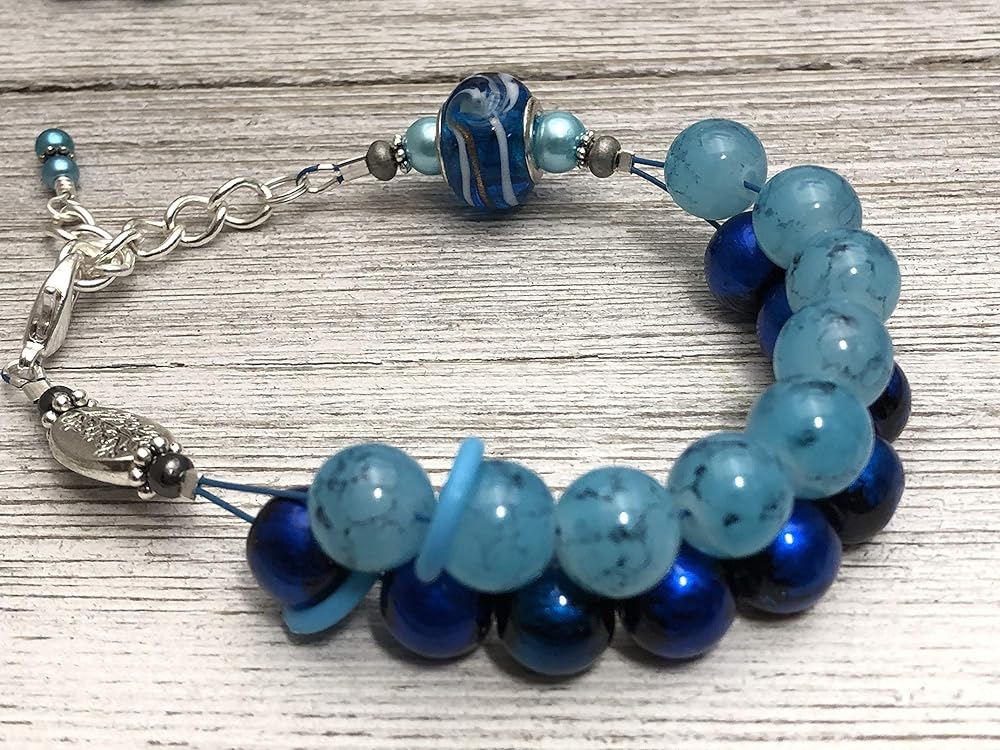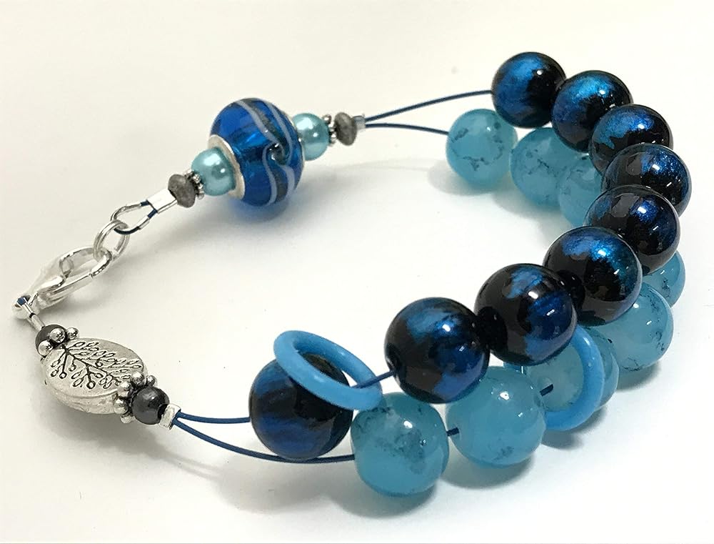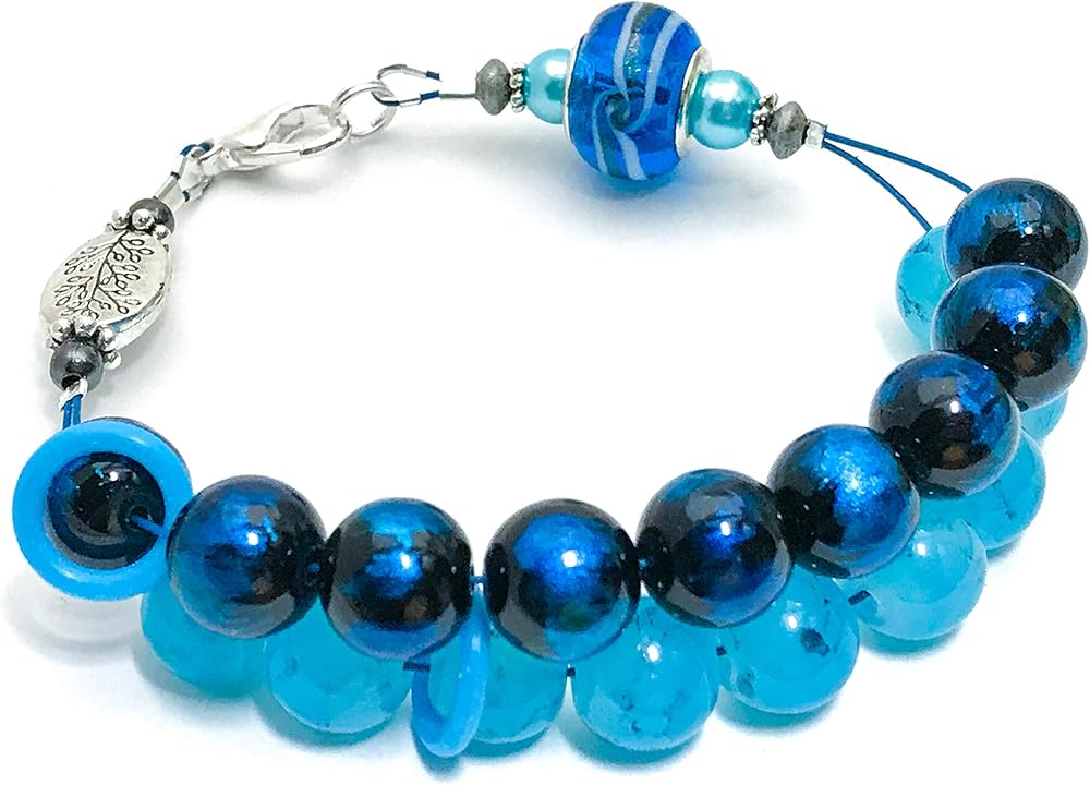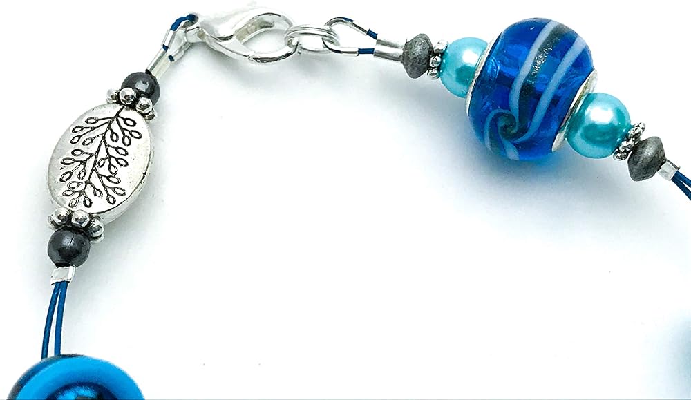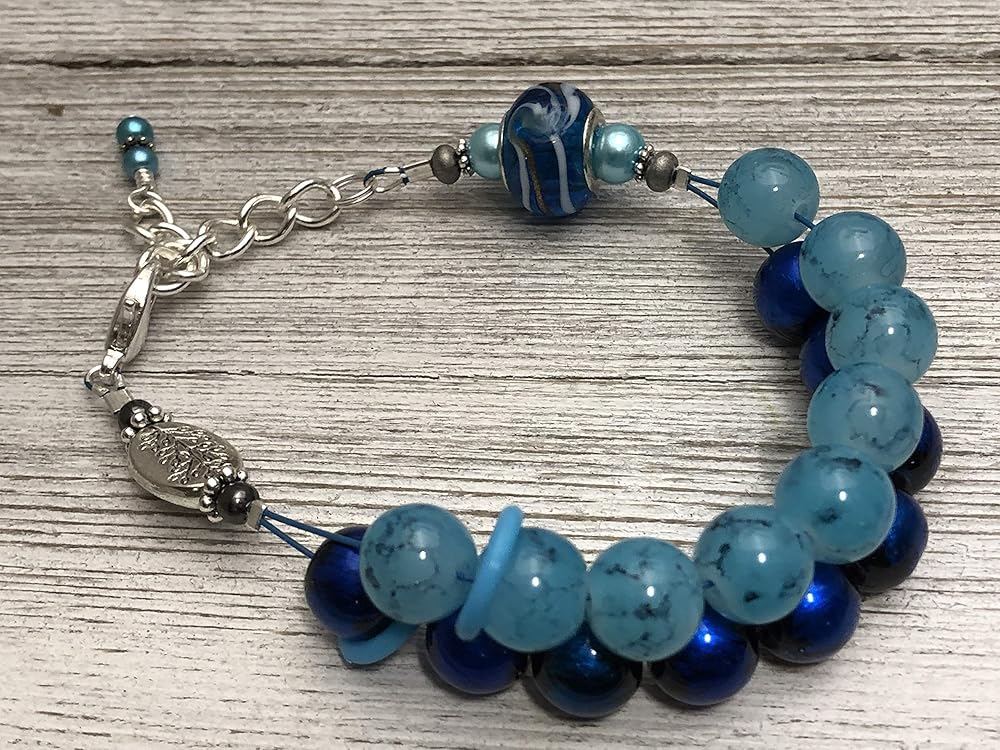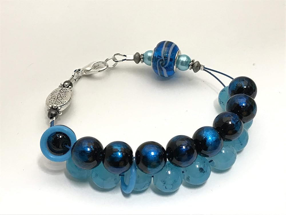 This amazing blue beaded bracelet is a knitting row counter. A stylish way to count your rows or stitches. By wearing your abacus style row counter on your wrist you will be able to keep track of your progress easily.