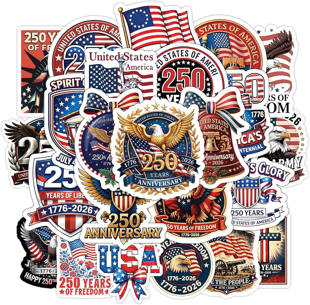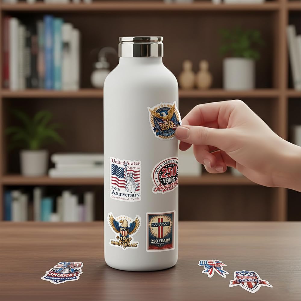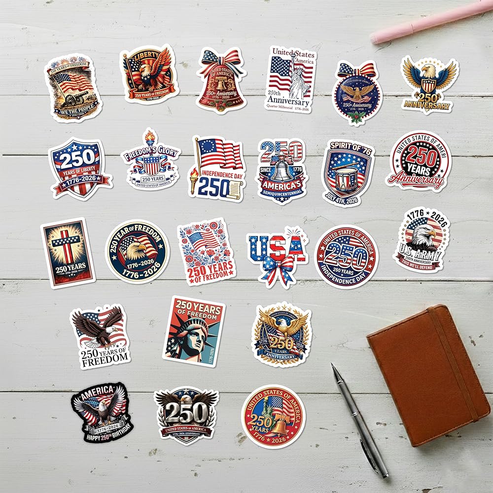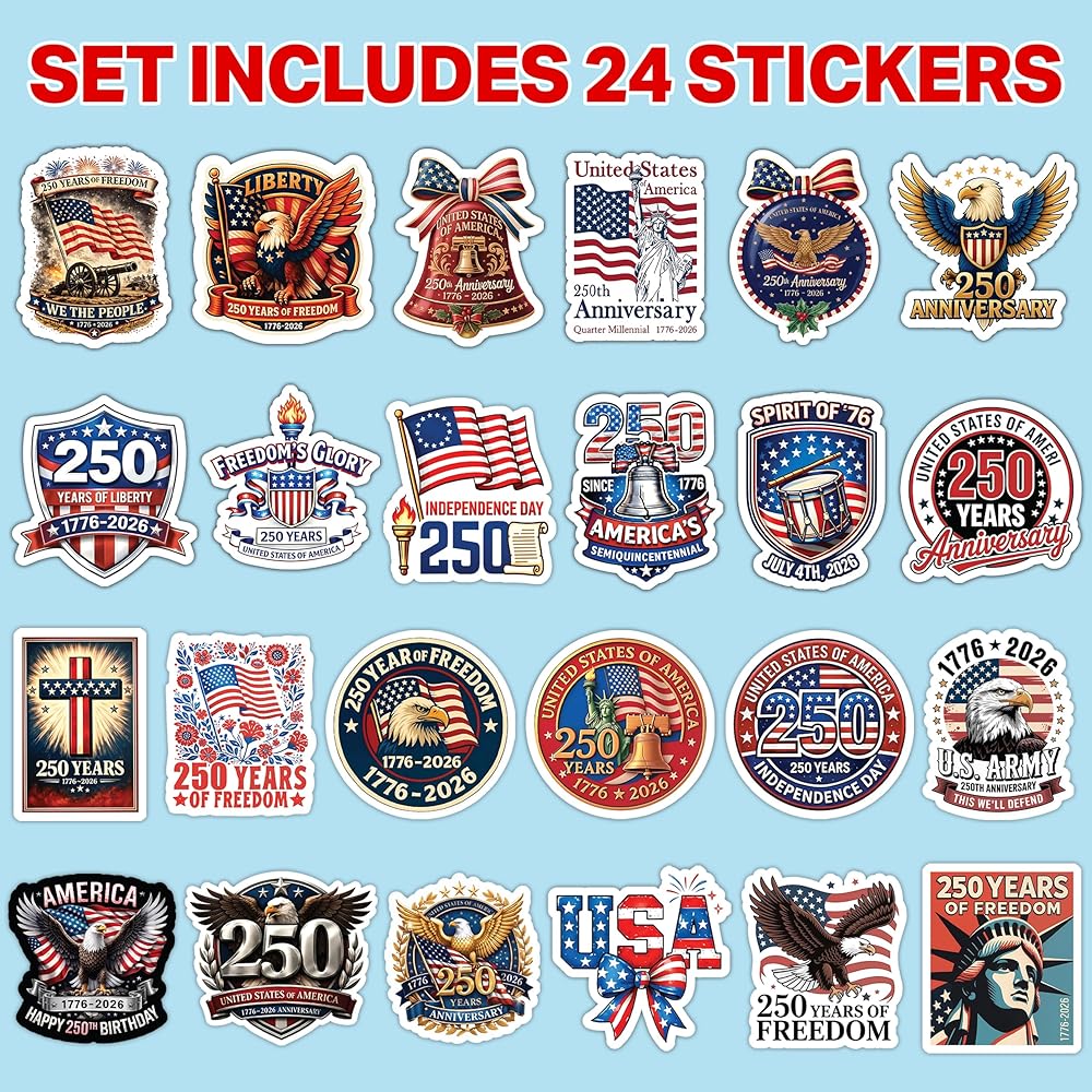 Celebrate America's 250th Anniversary in style with this 24 PCS America 250 sticker pack. Featuring bold patriotic designs inspired by 1776–2026 independence themes, these high-quality waterproof vinyl decals are perfect for laptops, water bottles, cars, windows, notebooks, and party decorations. Durable, vibrant, and easy to apply, they're great for 4th of July 2026 events, patriotic celebrations, and America 250 merchandise collections. A meaningful gift for proud Americans and collectors celebrating 250 years of freedom.