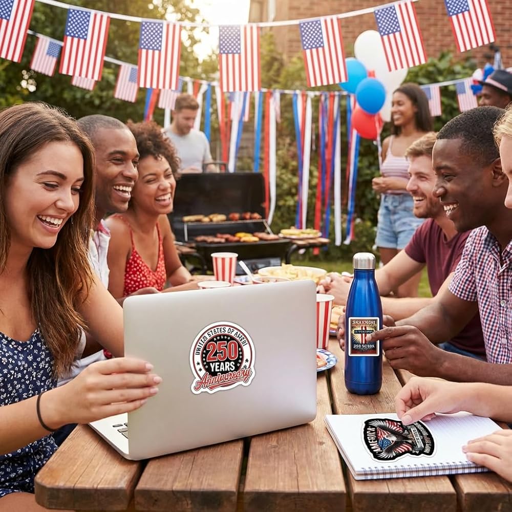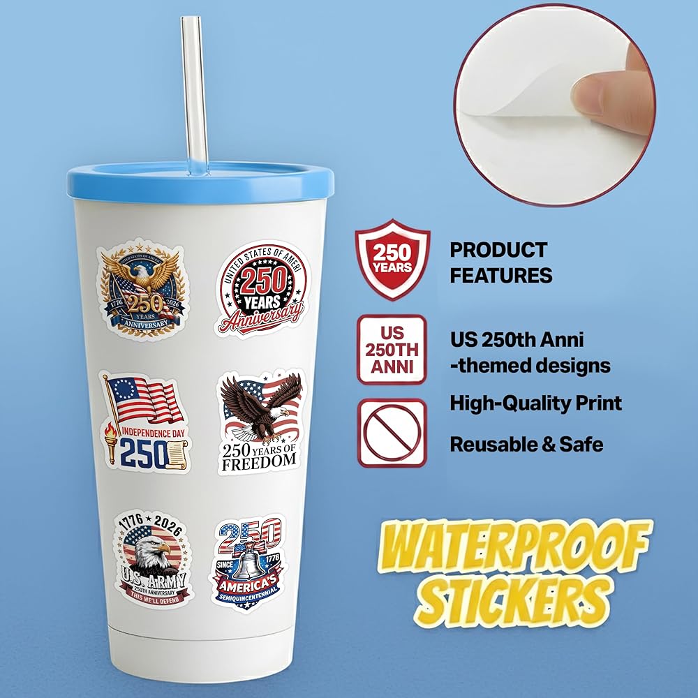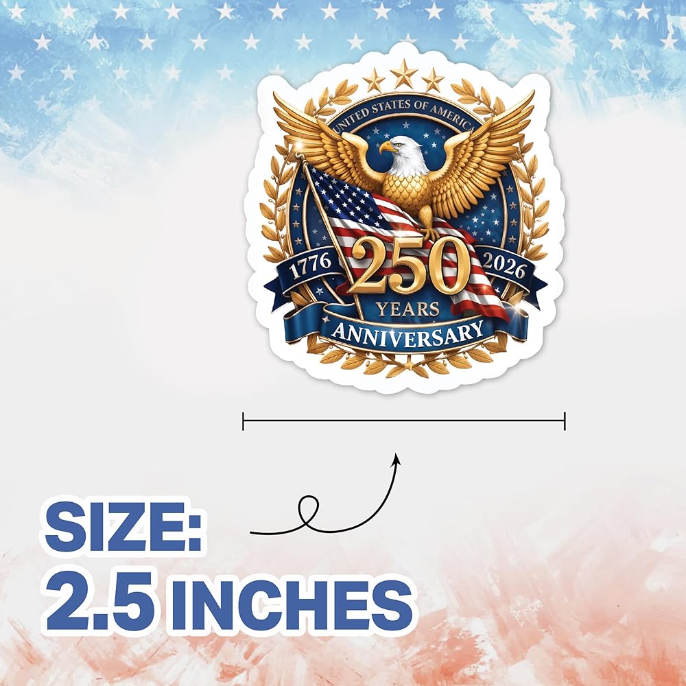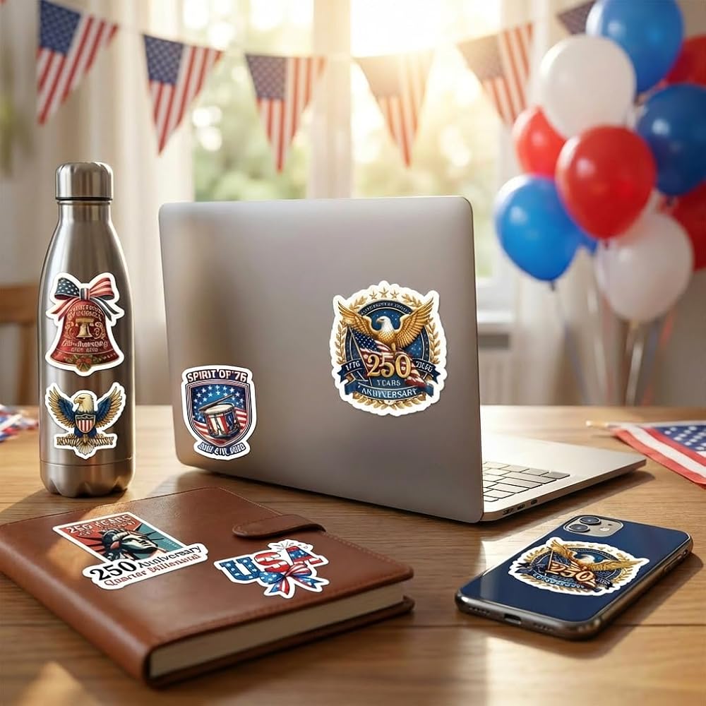 Celebrate America's 250th Anniversary in style with this 24 PCS America 250 sticker pack. Featuring bold patriotic designs inspired by 1776–2026 independence themes, these high-quality waterproof vinyl decals are perfect for laptops, water bottles, cars, windows, notebooks, and party decorations. Durable, vibrant, and easy to apply, they're great for 4th of July 2026 events, patriotic celebrations, and America 250 merchandise collections. A meaningful gift for proud Americans and collectors celebrating 250 years of freedom.
