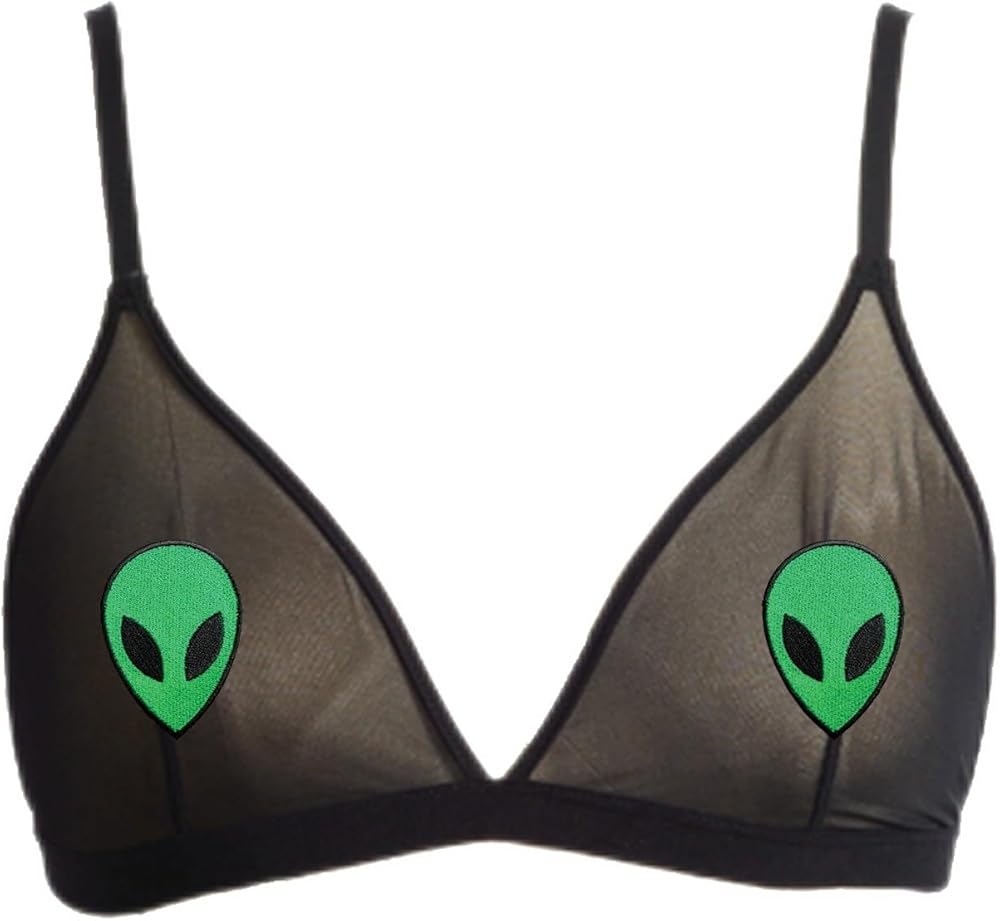 Black mesh bralette with alien iron on patches. S: 32B, 34A, 34B M: 34B. 36A, 36B L: 36B, 38A, 38Bc