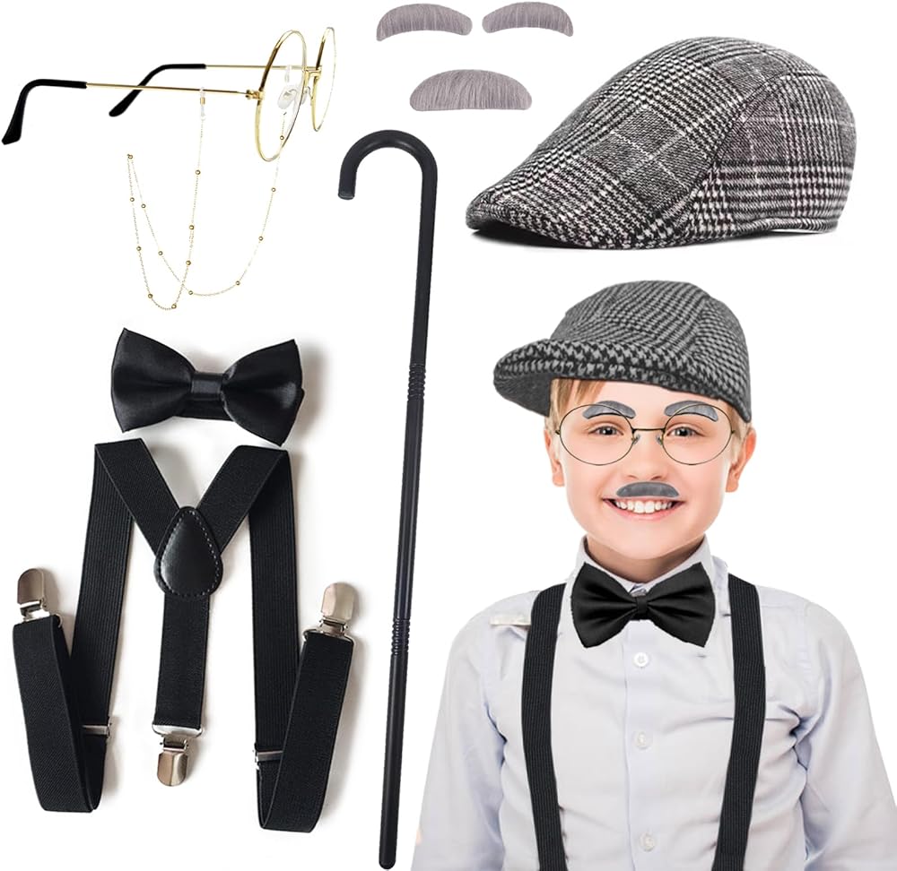 QUALITY OLD MAN COSTUME: The Old Man Costume includes 1 beret hat, fake cane, fake eyebrows and beard, bow tie, Y-back elastic suspender, glasses and eyeglass chain
