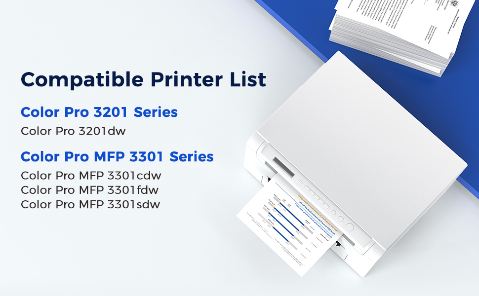 • توافق مضمون وجاهز للطباعة: تم تصميمه خصيصًا لطرازات HP Color LaserJet Pro 3201 series 3201dw وMFP 3301 series 3301cdw 3301fdw 3301sdw. ملاءمة مثالية وسهولة التركيب، وجاهزة للتعامل مع احتياجات الطباعة المنزلية العاجلة أو المهام والمشروعات المدرسية الهامة بشكل موثوق.