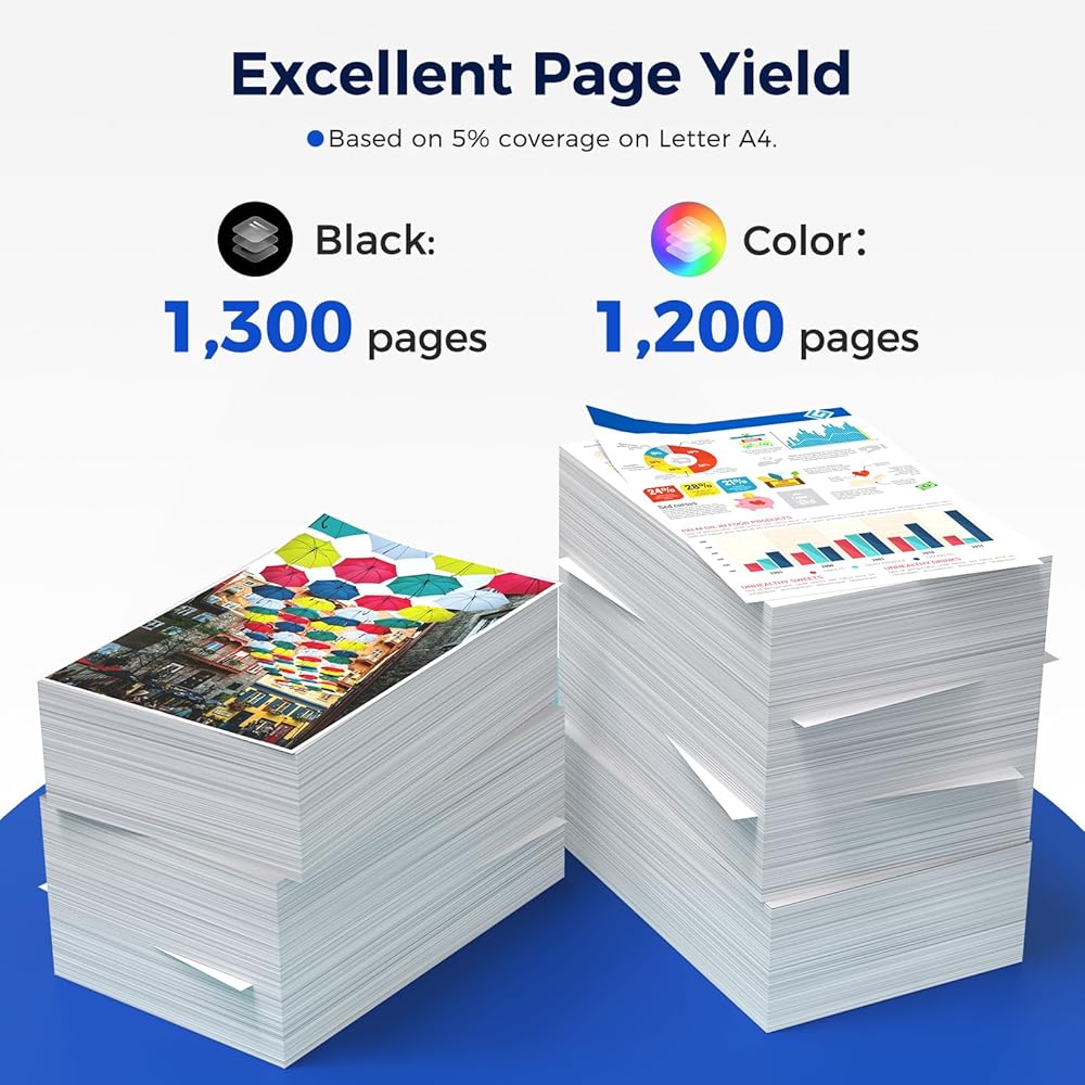 • 4 عبوات عالية الإنتاجية وفعالة من حيث التكلفة: توفر ما يصل إلى 1300 صفحة من الخرطوشة السوداء و1200 صفحة من كل لون (سماوي، أصفر، أرجواني) بتغطية قياسية بنسبة 5% للصفحة. يقلل التكلفة لكل صفحة، مما يجعله خيارًا اقتصاديًا للطباعة المنزلية الثقيلة ومهام الدراسة طويلة المدى.