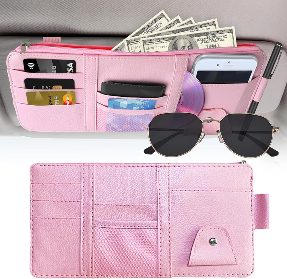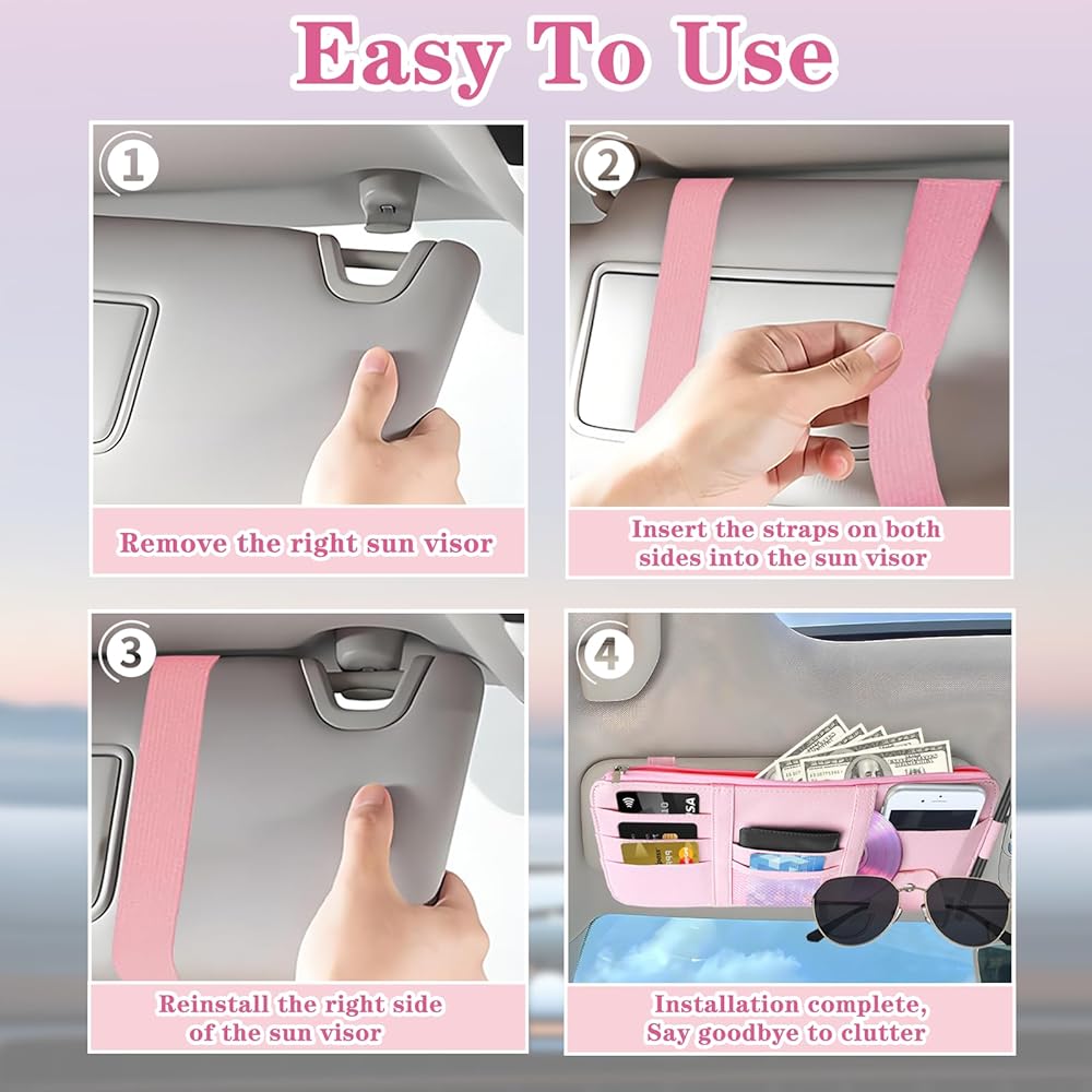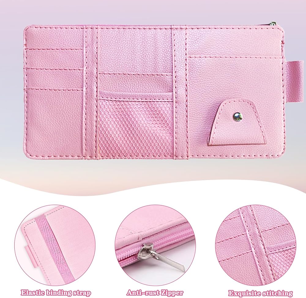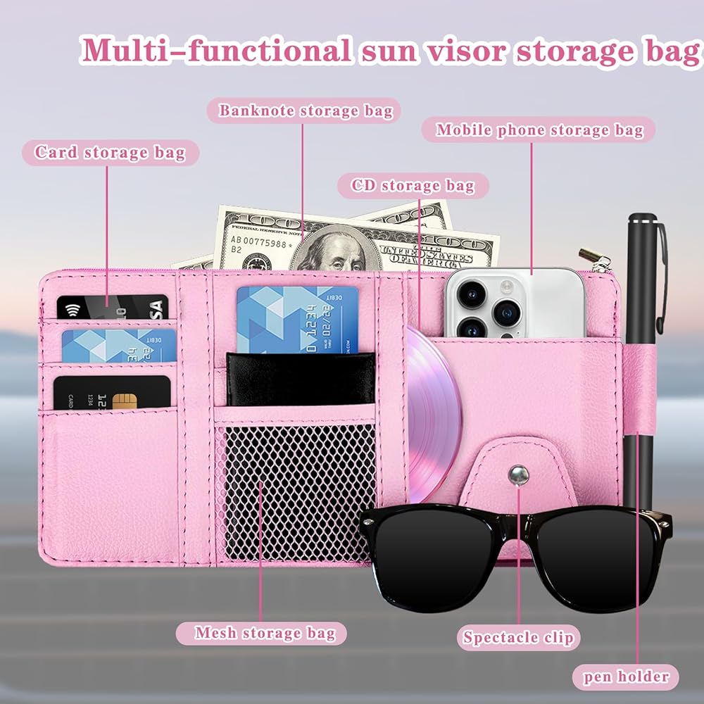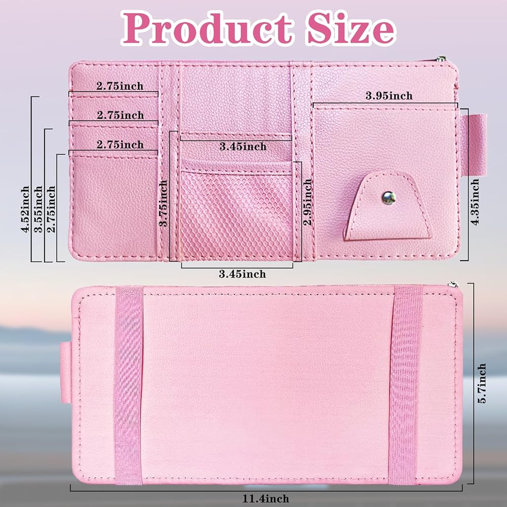 "Pink Car Sun Visor Organizer (29x15cm)Crafted from premium PU leather, this sleek pink organizer mounts securely to your sun visor with dual elastic bands, adding instant storage without blocking your view.Perfect Pocket Design:Stores sunglasses, cards, licenses, pens & documentsFeatures quick-access mesh pockets + zippered security compartmentUniversal fit for sedans, trucks, and SUVsAny questions? Contact us 24/7 for support!"