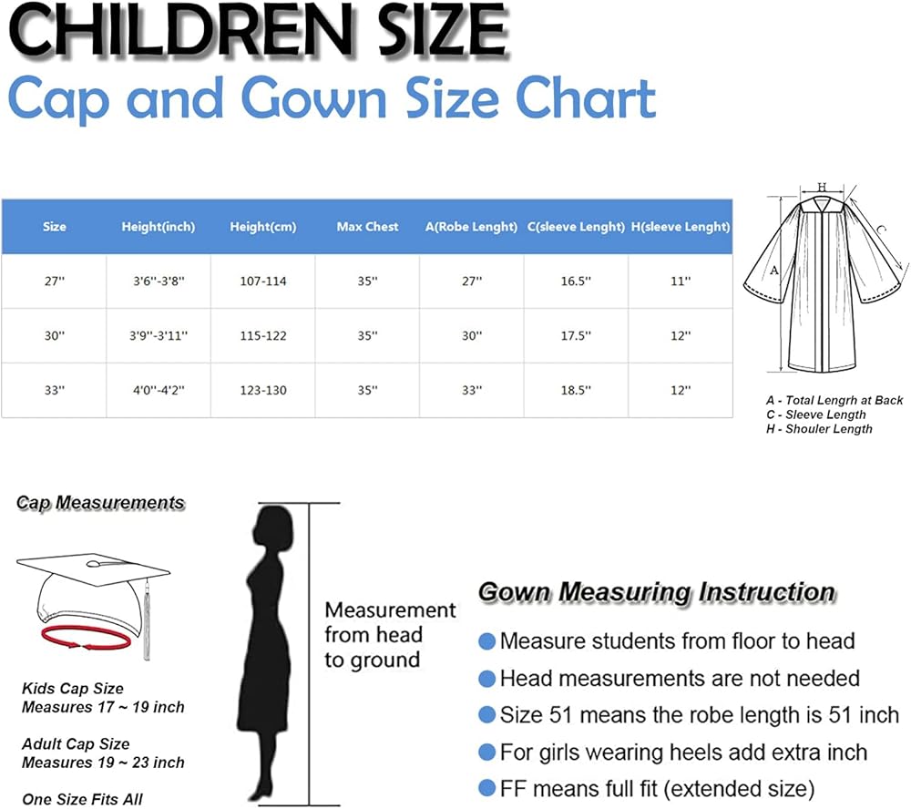 【SIZE SELECTION】: Graduation caps are fitted with adjustable elastic bands, so one size fits everyone. 27/30/33, sizes go by your HEIGHT,don't go by actual size,you would need to measure yourself from the floor to the top of head to get your height,and then choose the right size according to our size table