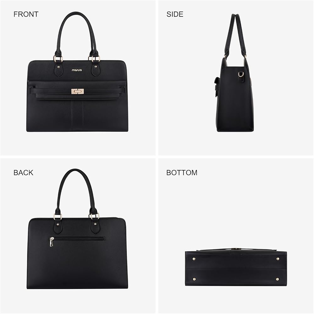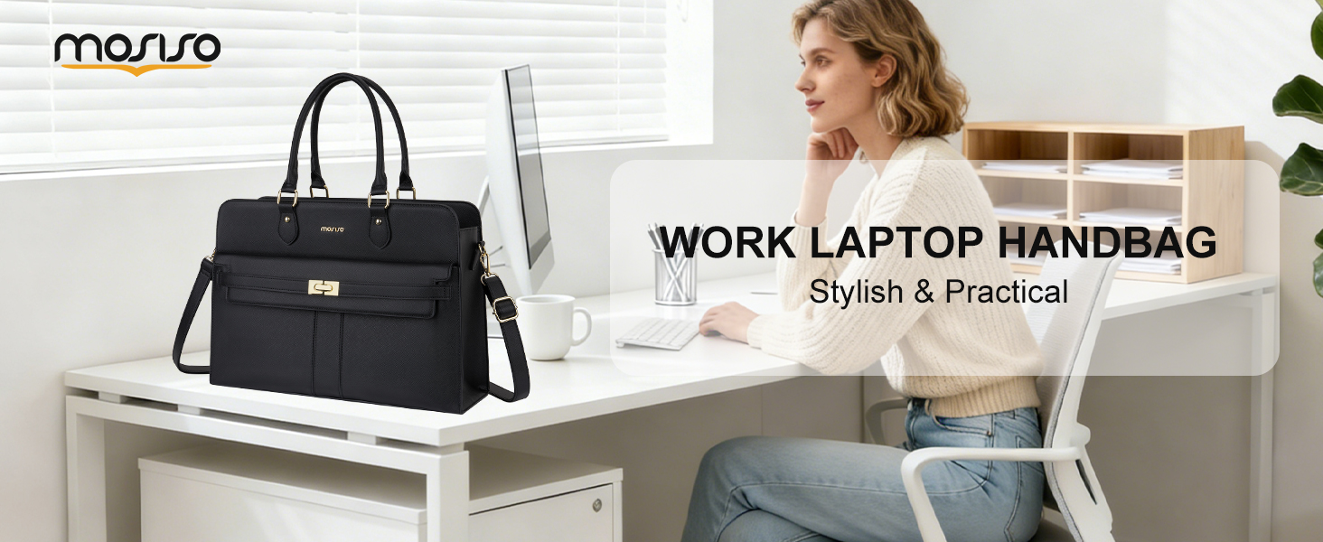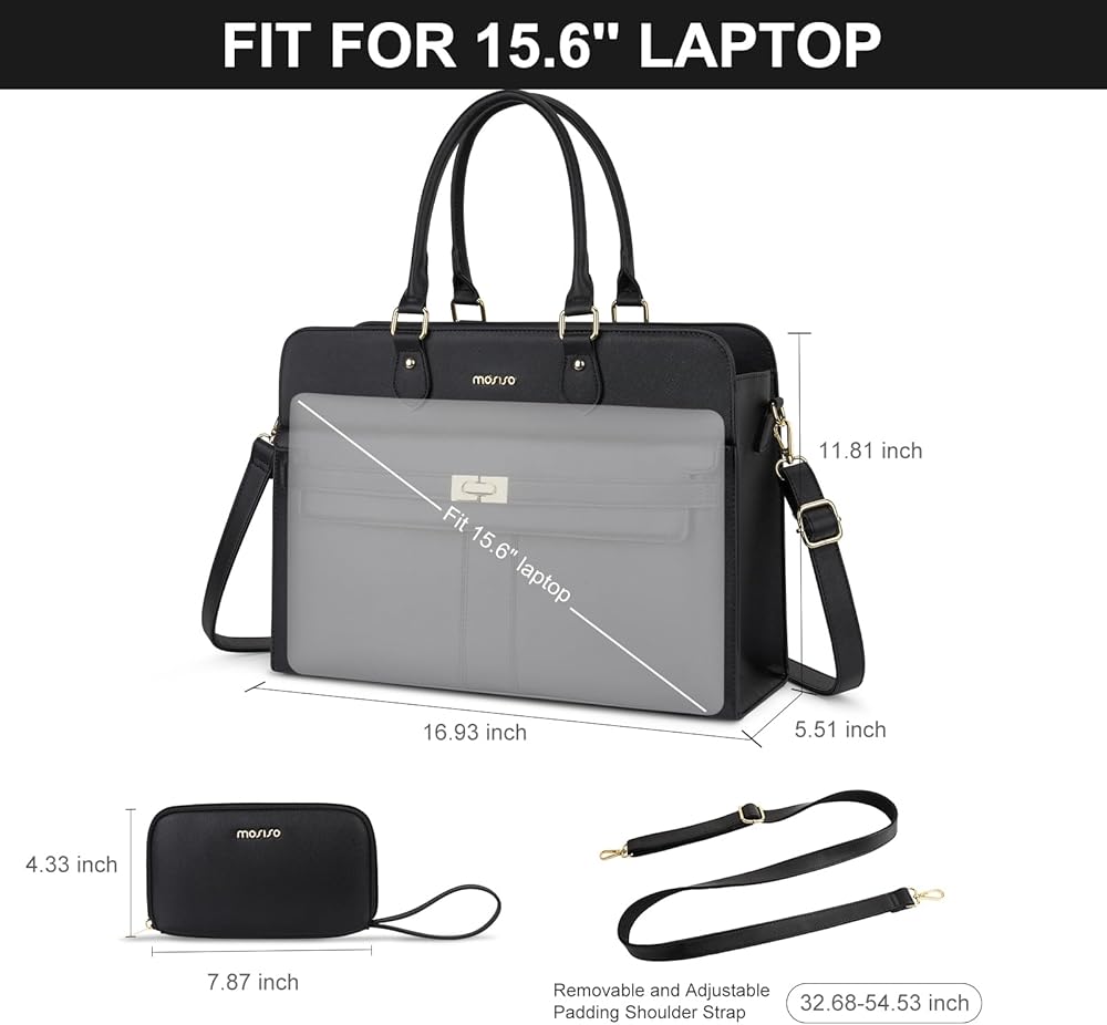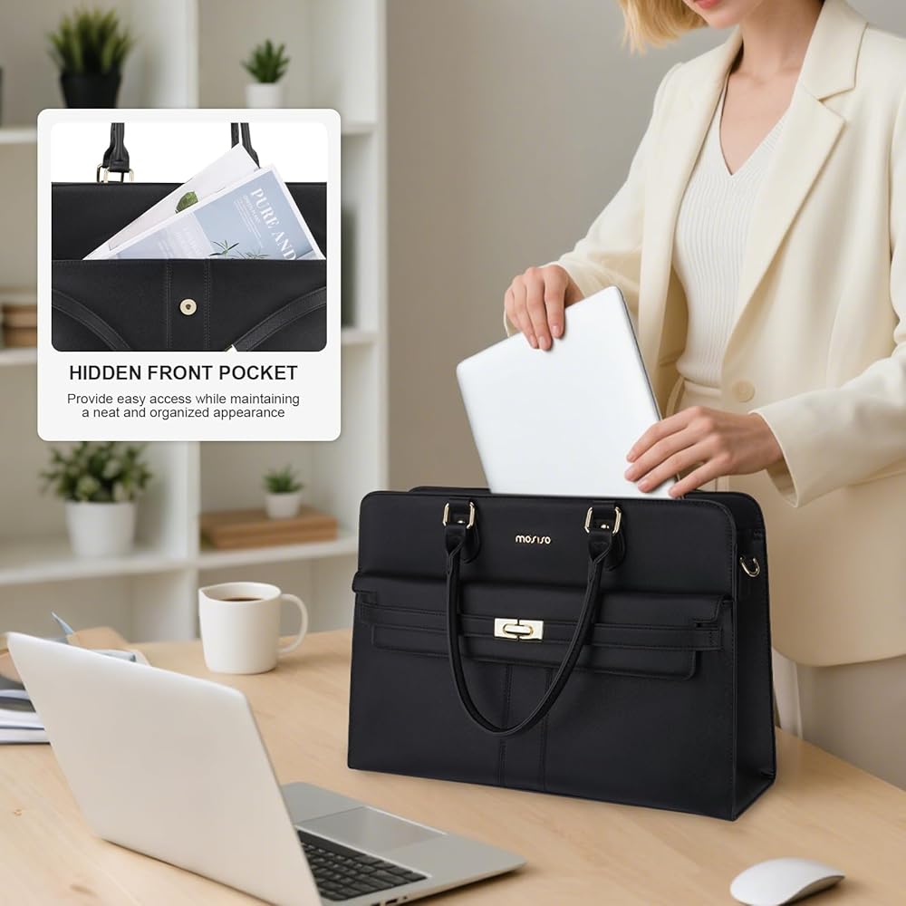 حقيبة كمبيوتر محمول للنساء من MOSISO، حقائب كمبيوتر محمول من جلد البولي يوريثان مقاومة للماء مقاس 15.6 بوصة، حقيبة حمل مع حجرة كمبيوتر محمول للأعمال، حقائب كتف ذات سعة كبيرة بمقبض علوي وحقيبة يد عمل المعلم، أسود