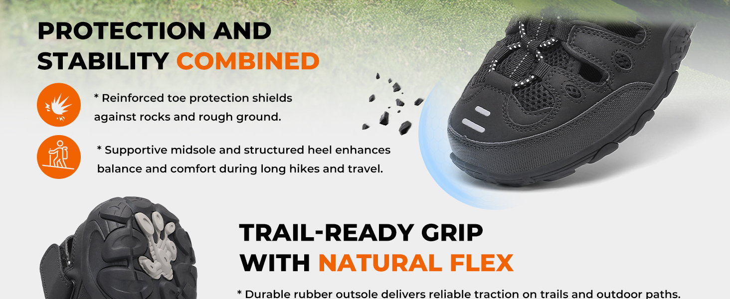 حماية متينة مغلقة عند أصابع القدم: تم تصميمها بتصميم معزز ومغلق عند أصابع القدم، تساعد صنادل المشي لمسافات طويلة هذه للرجال والنساء على الحماية من الصخور والجذور والتأثيرات غير المتوقعة على المسارات غير المستوية. مثالية للمشي لمسافات طويلة ومعابر الخور ورحلات التخييم والتضاريس الخارجية غير المستوية حيث تكون الحماية الإضافية ضرورية.
