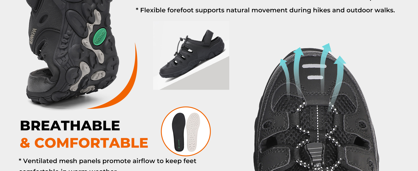 قبضة عالية الجر مع مرونة طبيعية: يتميز النعل الخارجي المطاطي المتين غير القابل للانزلاق بنمط جر عميق لقبضة موثوقة على الصخور الرطبة والشواطئ الرملية ومسارات الغابات غير المستوية. تم تصميم صنادل المشي لمسافات طويلة هذه بمقدمة قدم مرنة، وهي تدعم الحركة الطبيعية مع الحفاظ على الثبات أثناء المشي لمسافات طويلة ومعابر الخور والمشي على الشاطئ والمغامرات الخارجية.