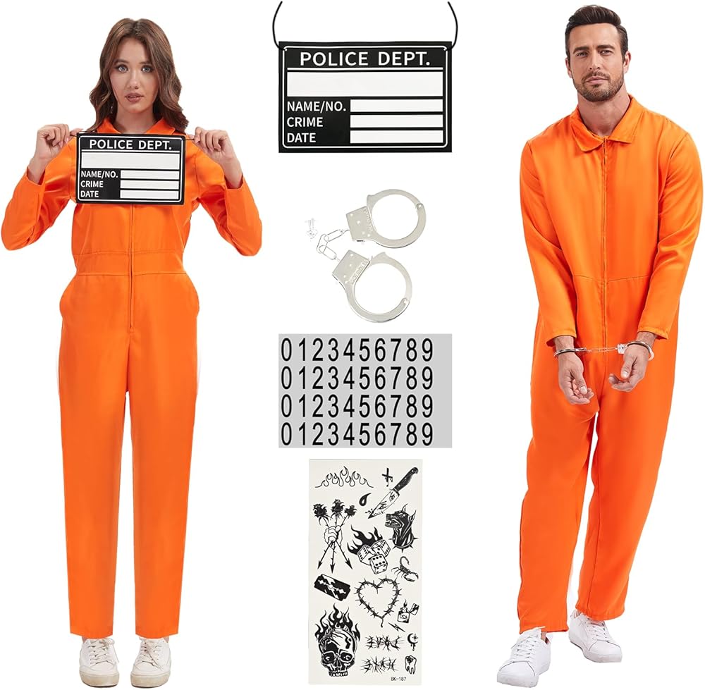 women orange prisoner set: Includes 1 Pcs jumpsuit, 1 pair of handcuffs, 2 tattoo stickers, 1 number sticker, 1 name tag.