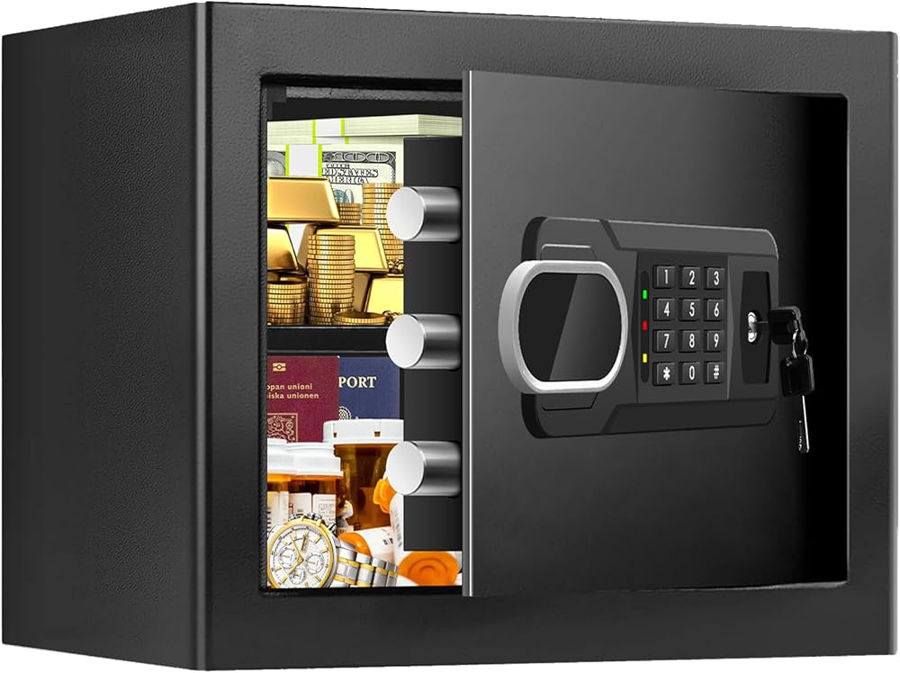• 【هيكل فولاذي متين】: مصنوع من سبائك الفولاذ، هذا الأمان الآمن قوي وموثوق. يتميز بمسامير قفل دائرية بسمك 20 مم، مما يوفر أقصى قدر من الأمان والحماية لمقتنياتك الثمينة. لقد خضعت الخزنة الفولاذية لاختبارات صارمة، مما أثبت متانتها المتميزة وجودة المواد.