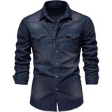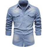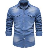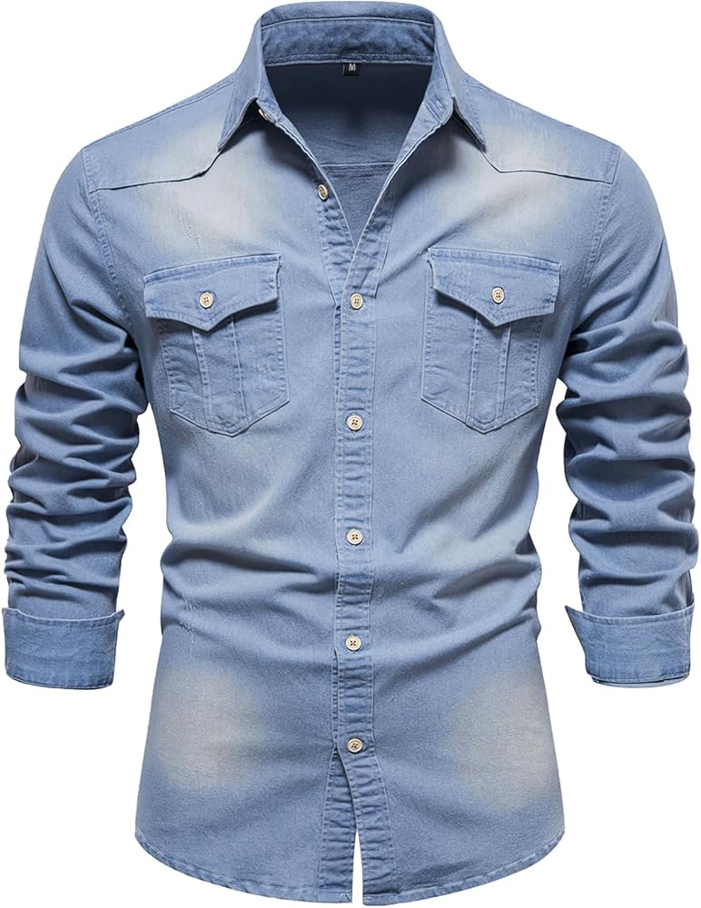 قميص Eisctnd الرجالي من الدنيم بأزرار سفلية، قمصان عمل كلاسيكية بأكمام طويلة مع جيبين in Kuwait
