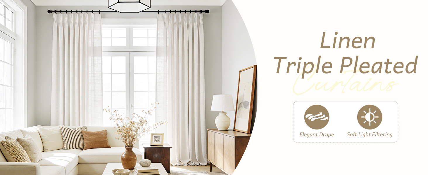 نسيج مزيج الكتان الفاخر - مصنوعة من مواد مزيج الكتان عالية الجودة، تتميز هذه الستائر ذات الطيات الثلاثية بملمس ناعم ومسامي مع طبقات طبيعية رقيقة. ينثني القماش بسلاسة مع توفير مقاومة أفضل للتجاعيد ومتانة أفضل من الكتان النقي، مما يجعله مثاليًا للاستخدام اليومي في التصميمات الداخلية الحديثة والتقليدية.
