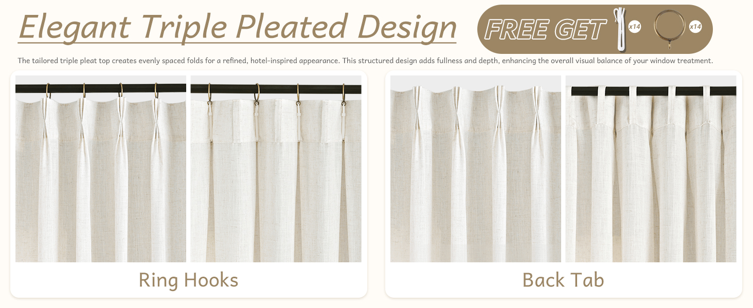 خيارات تعليق متعددة الاستخدامات - تحتوي كل حزمة ستارة على 14 خطافًا و14 حلقة معدنية. تخلق العروة المخفية مظهرًا سلسًا ومخفيًا للقضيب مع طيات متدفقة، بينما يبرز التعليق بالحلقات الطيات الثلاثية للحصول على لمسة نهائية أنيقة ومنظم.