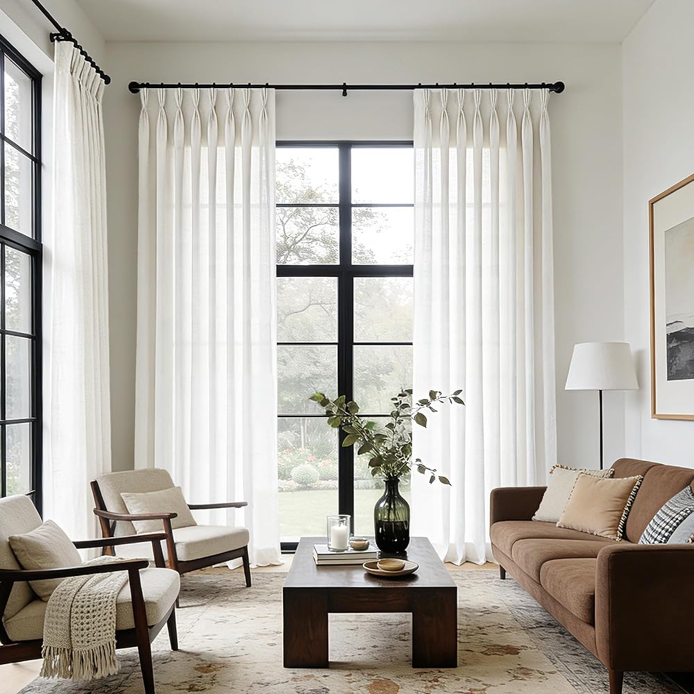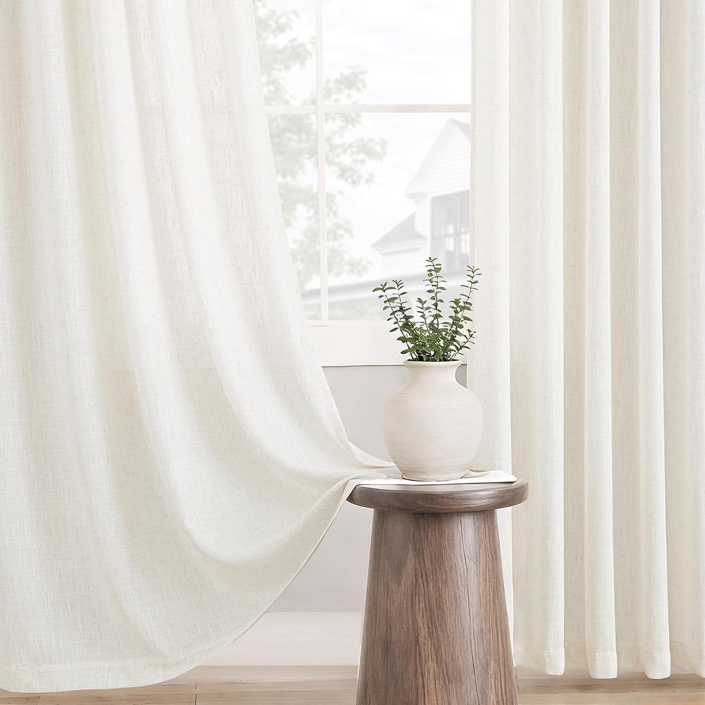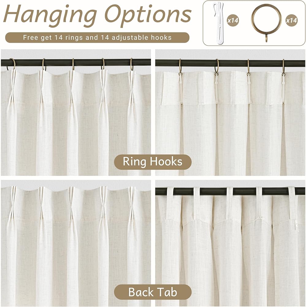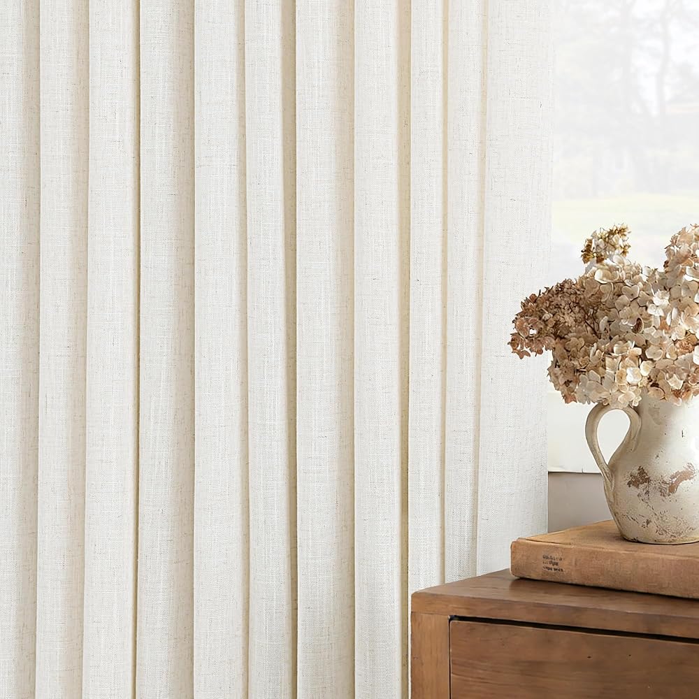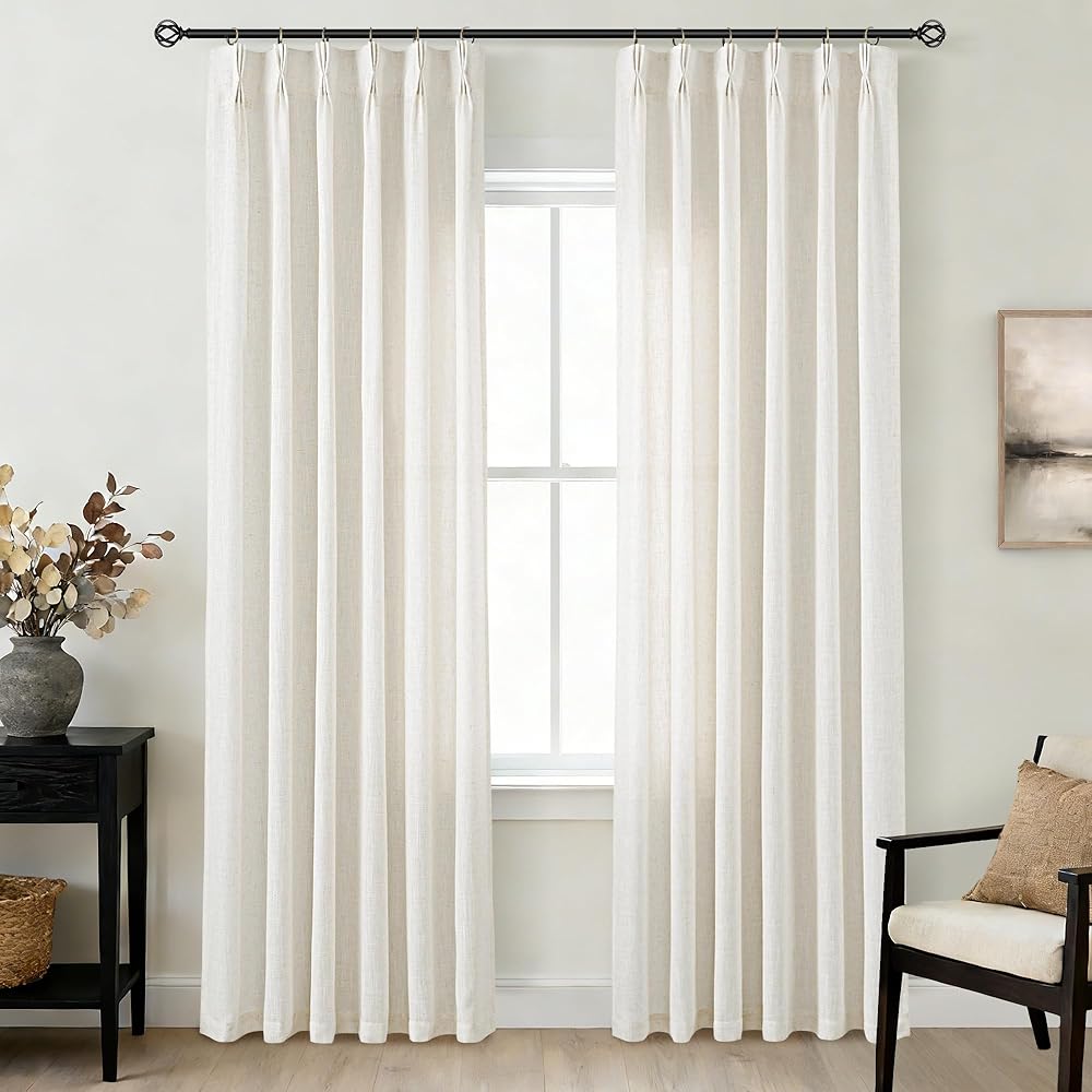ستائر كتان طويلة مطوية بقرصة ثلاثية مقاس 90 بوصة، مجموعة من لوحتين لغرفة المعيشة، ستائر نظام المسار محايدة وحديثة للمزرعة، مرشحة للضوء، مزيج من الكتان شبه الشفاف، ستائر مطوية بقرصة 90 طول كريمي