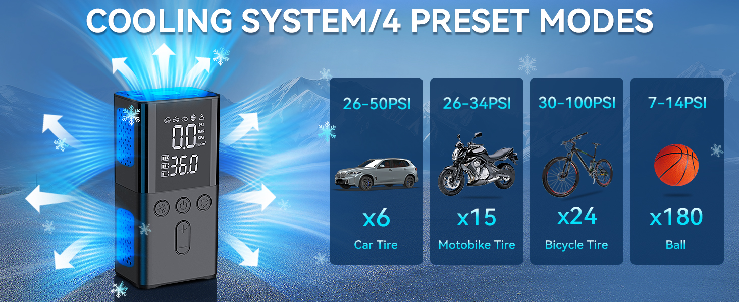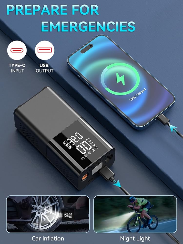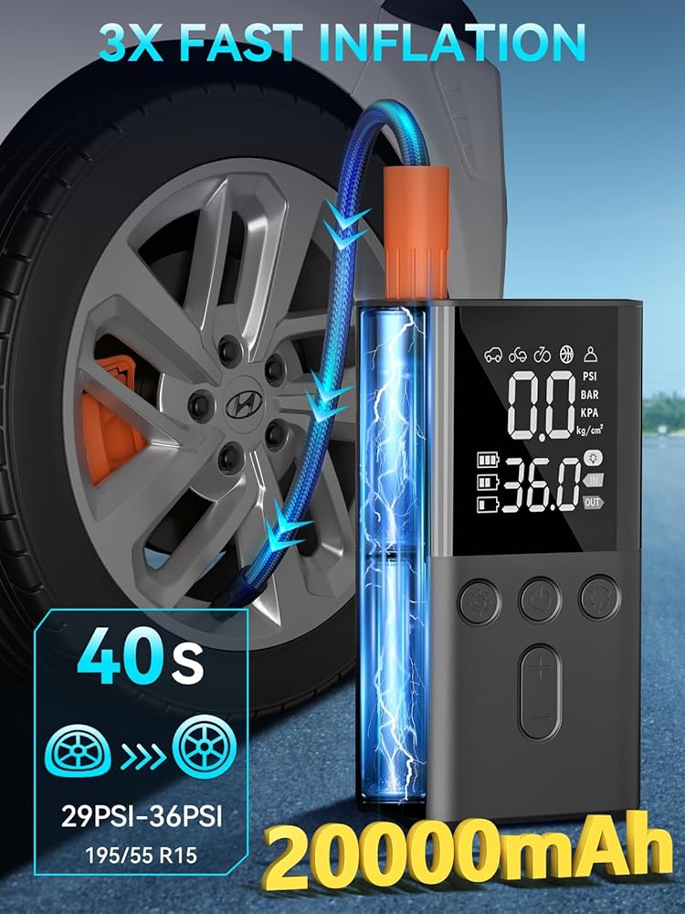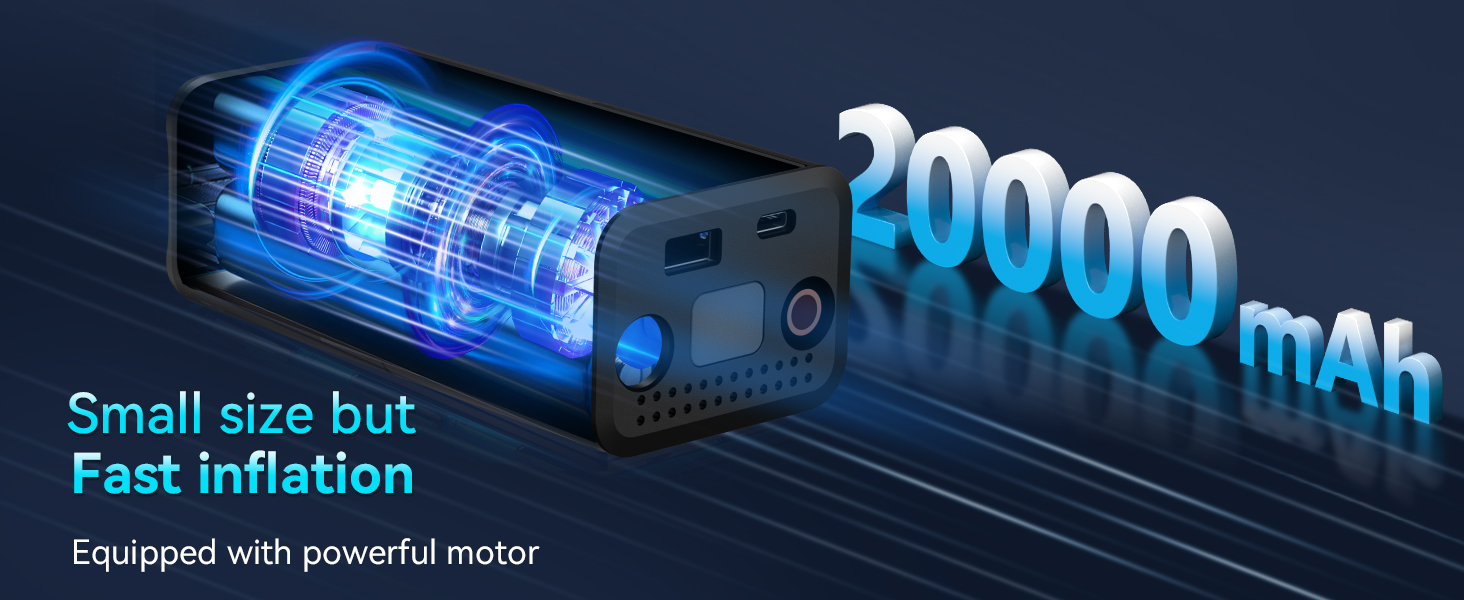 🏍️【ترقية سعة البطارية】سعة بطارية 20000 مللي أمبير، مقارنة بضاغط الهواء القديم للسيارة الذي يمكنه نفخ 3 إطارات فقط، يمكن لمضخة الهواء الجديدة الخاصة بنا لسعة إطارات السيارة نفخ 15 إطارًا بعد ترقية السعة! !