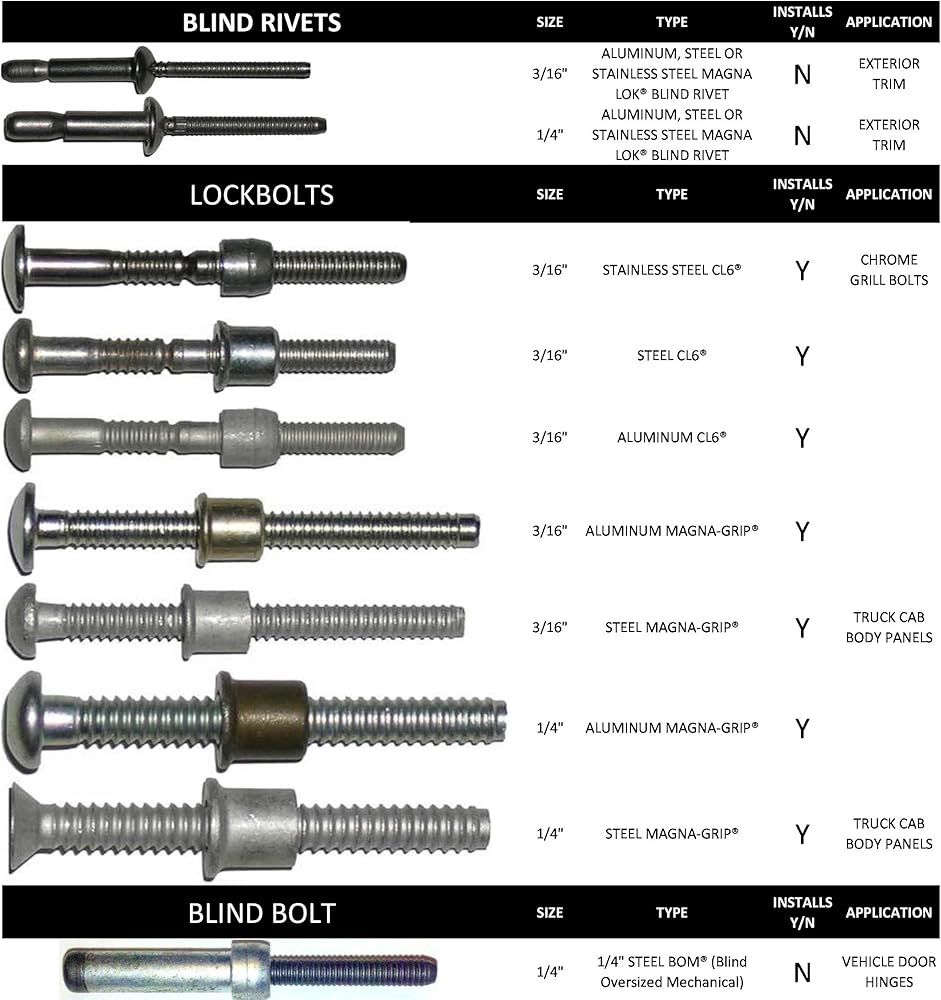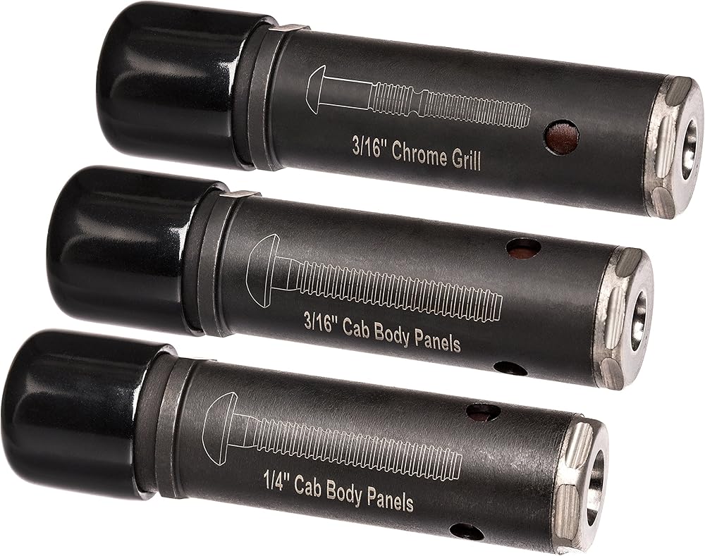 • This aggressively priced tool installs up to 1/4" Magna-grip lockbolts and is capable of installing all lockbolt and blind fasteners used in truck cab bodywork. It is compatible with Huck 202, 210, 212, 244, 2025, 229, 230, Gage Bilt 722, 730, 731 and uses the same 3/4" diameter noses. This kit includes 3/16" & 1/4" Magna-Grip noses used to install cab body panels and a 3/16" C6 nose used to install chrome grill bolts.