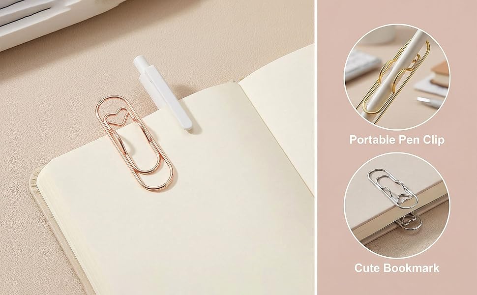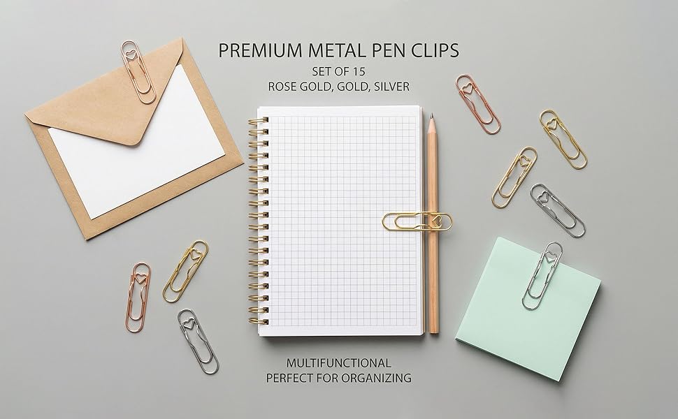 تشتمل هذه المجموعة على 15 مشبك قلم معدني على شكل قلب (5 ذهبي، 5 فضي، 5 ذهبي وردي)، مصممة لتثبيت الأقلام في دفاتر الملاحظات وحمل دبابيس ورق صغيرة - لتحل محل الأقلام السائبة التي تنزلق من جيوب الحقائب أو أغطية أجهزة الكمبيوتر المحمول، وتوفر حلاً متعدد الأغراض لتنظيم أدوات الكتابة. كمشبك قلم، يتم ربط كل مشبك بقوة بحواف دفتر الملاحظات، مما يحافظ على الأقلام في متناول اليد مع إضافة لمسة زخرفية رقيقة إلى القرطاسية العادية أو المنقوشة.