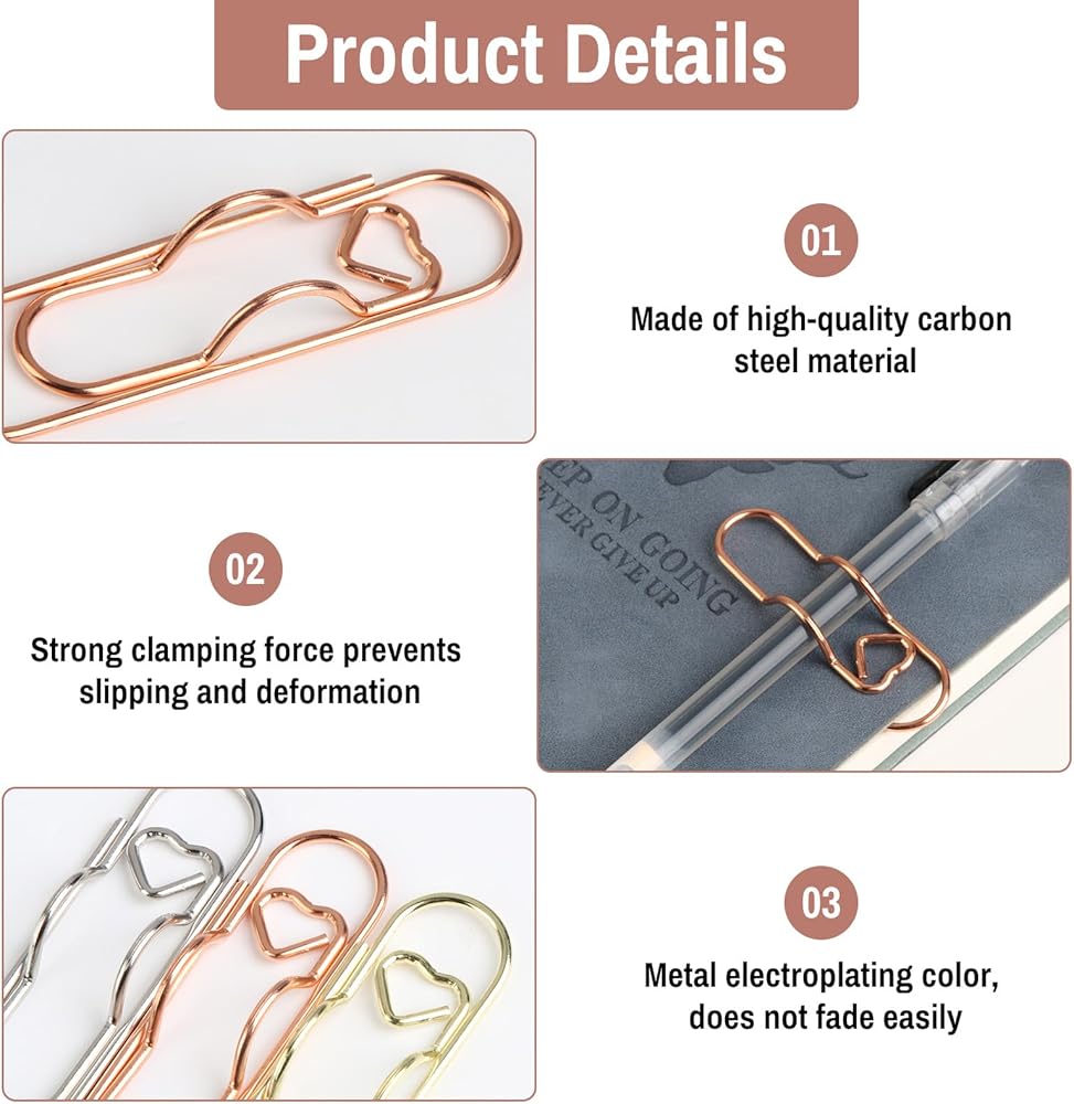 تشتمل الميزات الرئيسية على 3 خيارات ألوان (تتوافق مع أنماط أجهزة الكمبيوتر المحمولة/القلم المتنوعة)، ووظيفة مزدوجة (تأمين الأقلام + تخزين مشابك الورق)، وحجم صغير. يحافظ المشبك المعدني على ثباته، ولن ينزلق من أجهزة الكمبيوتر المحمولة حتى عند حملها في حقائب الظهر، كما أن السطح المصقول يقاوم تلطخ بصمات الأصابع. باعتبارها ملحقات للسجلات، فإنها تضيف لمسة مرحة وأنيقة إلى دفاتر الملاحظات أو مذكرات السفر أو مخططي الدراسة.