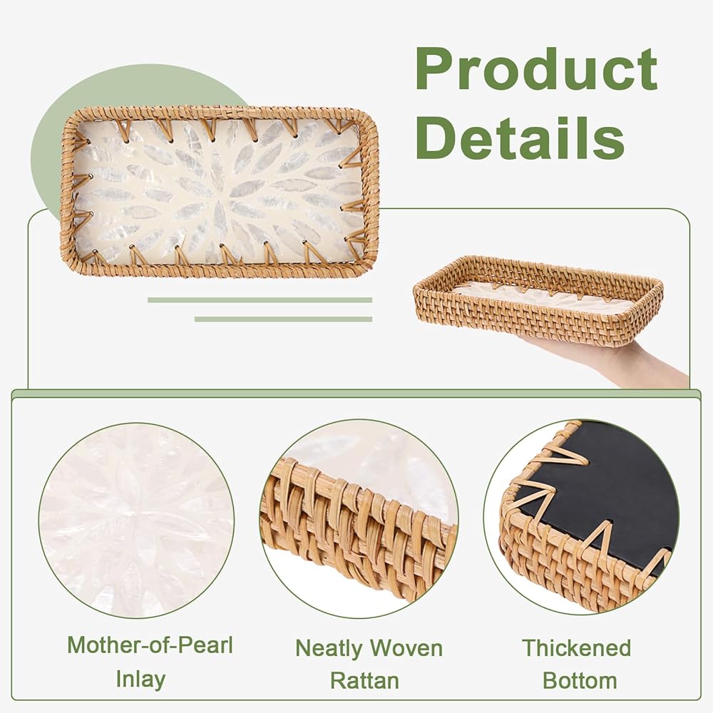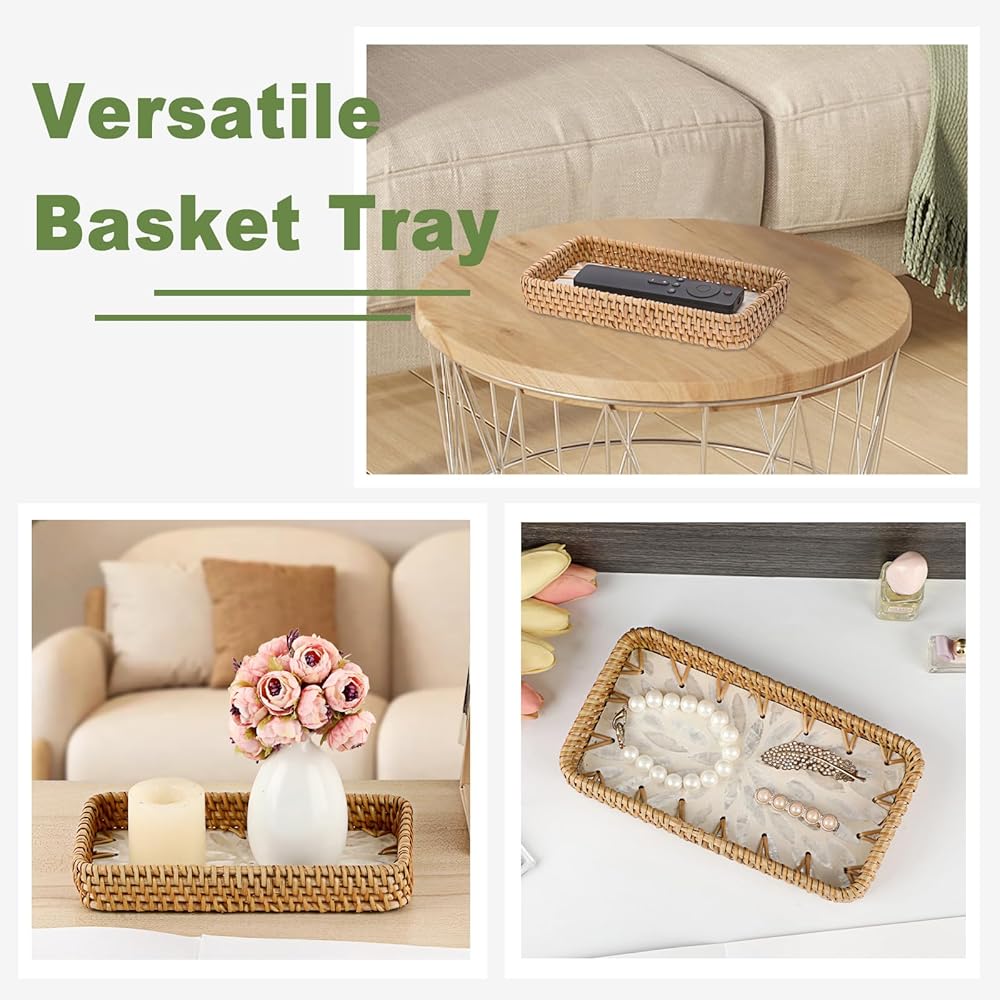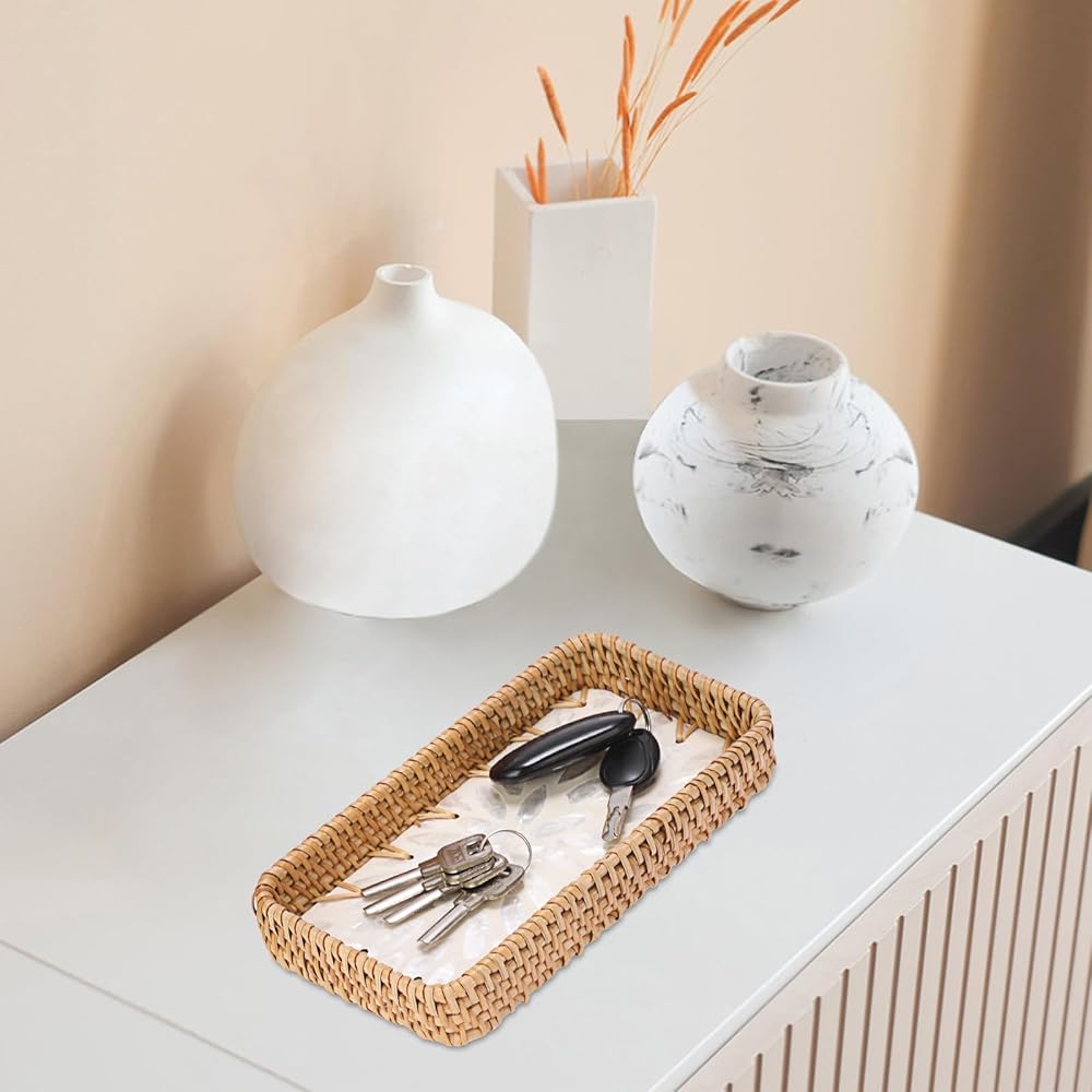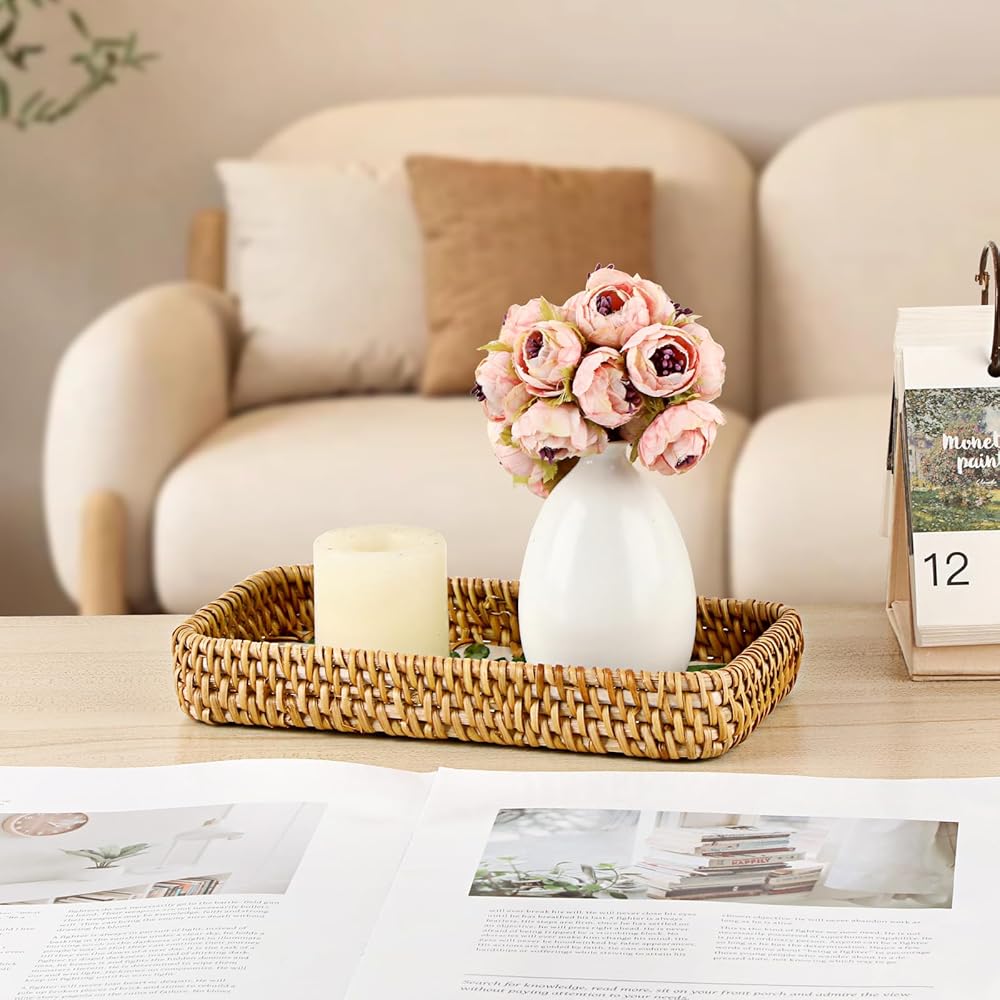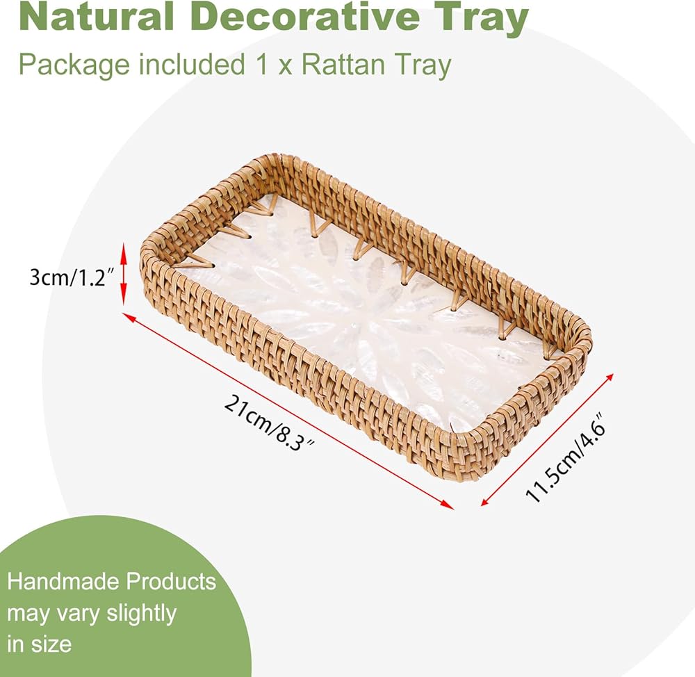 صينية الروطان المدمجة والعملية: تتضمن العبوة صينية تخزين مستطيلة من الروطان. يبلغ مقاسها 8.3 بوصة طولًا × 4.6 بوصة عرضًا × 1.2 بوصة ارتفاعًا. تناسب تمامًا أي مساحة، ولكنها توفر سعة تخزينية وخدمة كبيرة