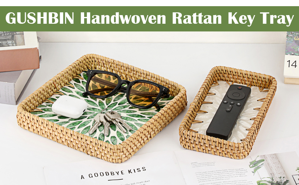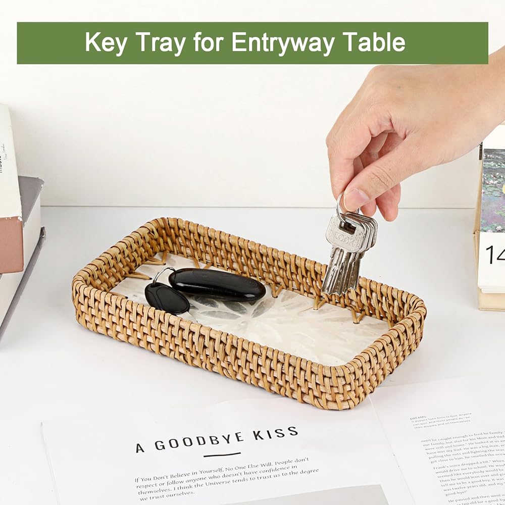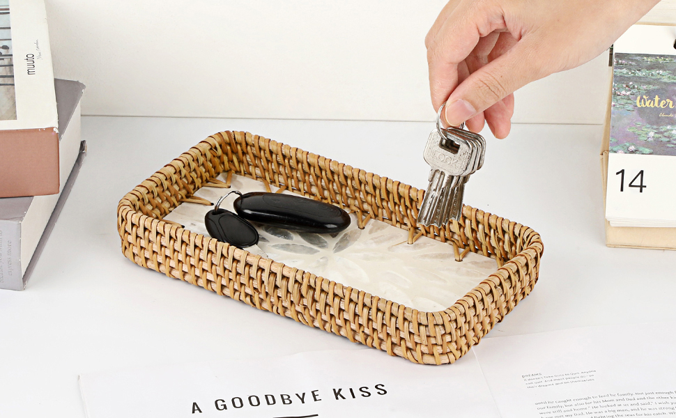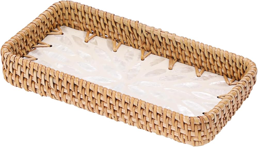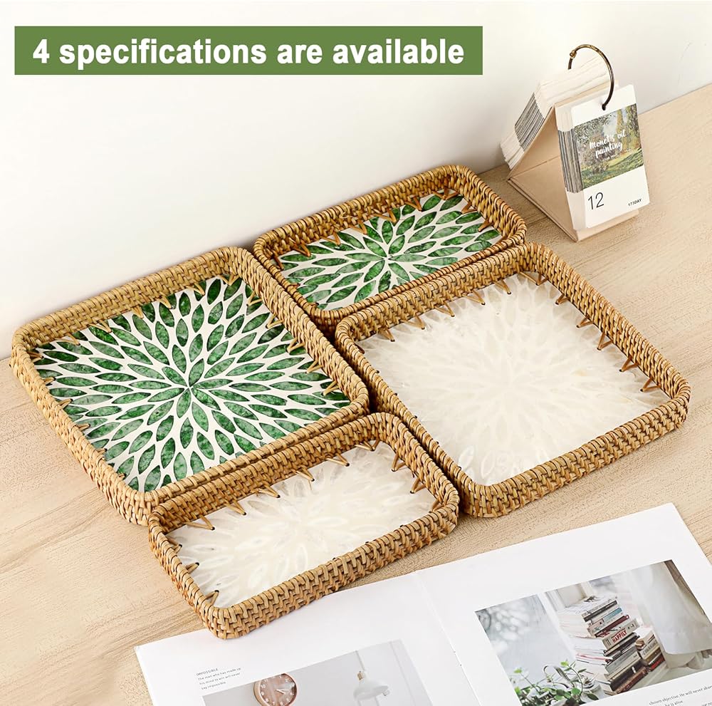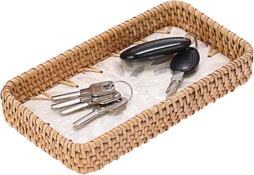 صينية الروطان المدمجة والعملية: تتضمن العبوة صينية تخزين مستطيلة من الروطان. يبلغ مقاسها 8.3 بوصة طولًا × 4.6 بوصة عرضًا × 1.2 بوصة ارتفاعًا. تناسب تمامًا أي مساحة، ولكنها توفر سعة تخزينية وخدمة كبيرة