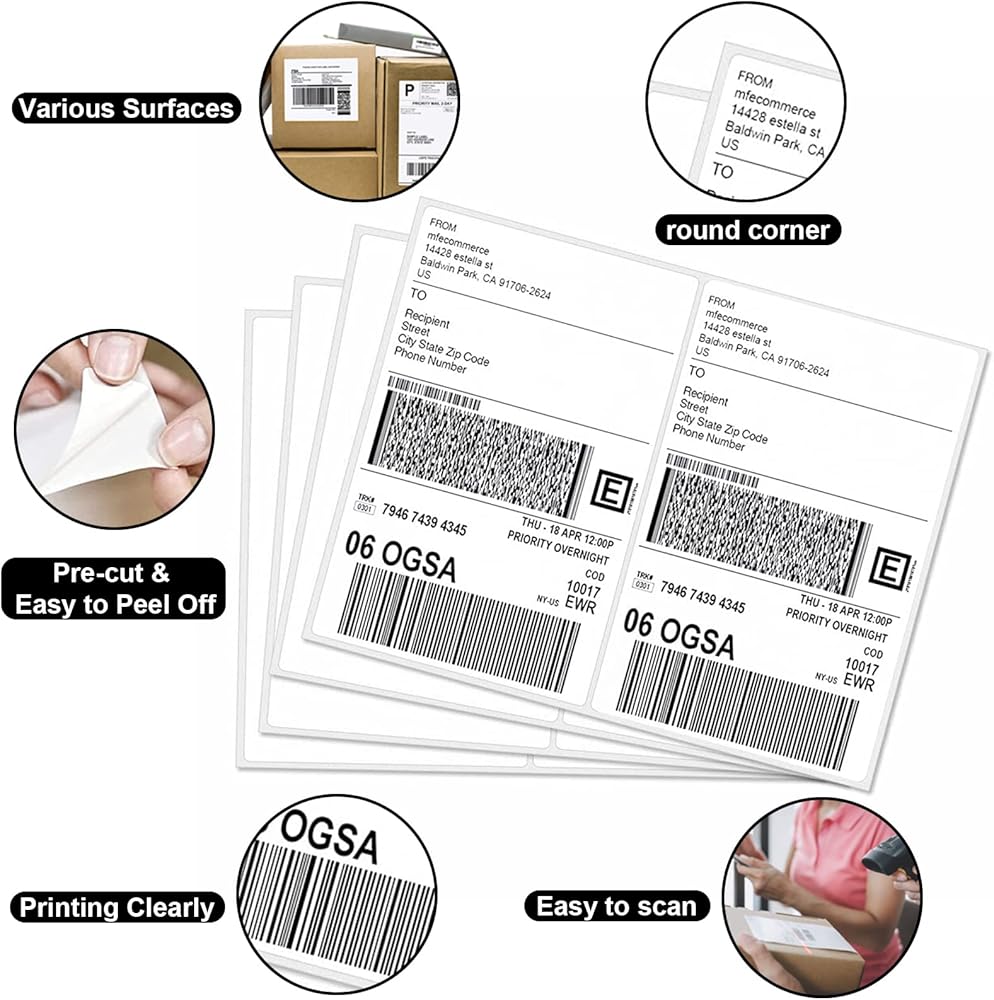 【PRINT, PEEL AND STICK】Special rounded corner design is more convenient for your using! Rounded corner and pre-cut design make it so easier to peel off from sheets, and very clear as to which is the label side, and which is the back. Just peel off the address label, place it on the packaging and gently press it from one side to the other. This will prevent your package from being lost due to the address label falling off.