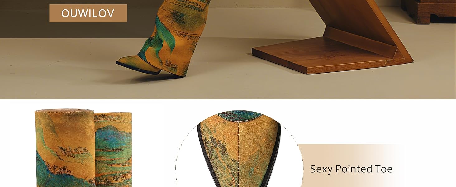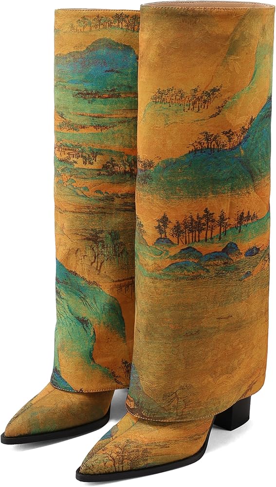 بيان طباعة المناظر الطبيعية الفنية، أحذية رعاة البقر القماشية المستوحاة من المعرض بطباعة المناظر الطبيعية تحول الأحذية الغربية إلى فن يمكن ارتداؤه. أنماط المناظر الجبلية تجعل من كل زوج مظهرًا جريئًا للمهرجانات والرحلات البرية والأزياء على طراز الشارع