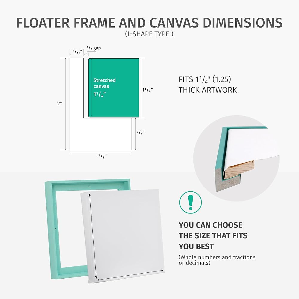 • [ Floater Frame ] Our L-shape style Floater Frame profile is designed to ensure a minimum 1/8" gap between the frame side-wall and your painting. The frame thickness stands at 2 inch, with a 1/2 inch wide visible edge on the face. In addition to the standard V-Nails assembly at the corners of each frame, we take extra measures to reinforce the sturdiness of the frame corner joints
