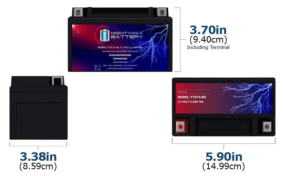 الأبعاد: 5.90 بوصة × 3.38 بوصة × 3.70 بوصة. القطبية: موجب على اليسار، سلبي على اليمين. القائمة مخصصة للبطارية والمسامير فقط. لا يتضمن أي سرج سلكي أو ملحقات تثبيت.
