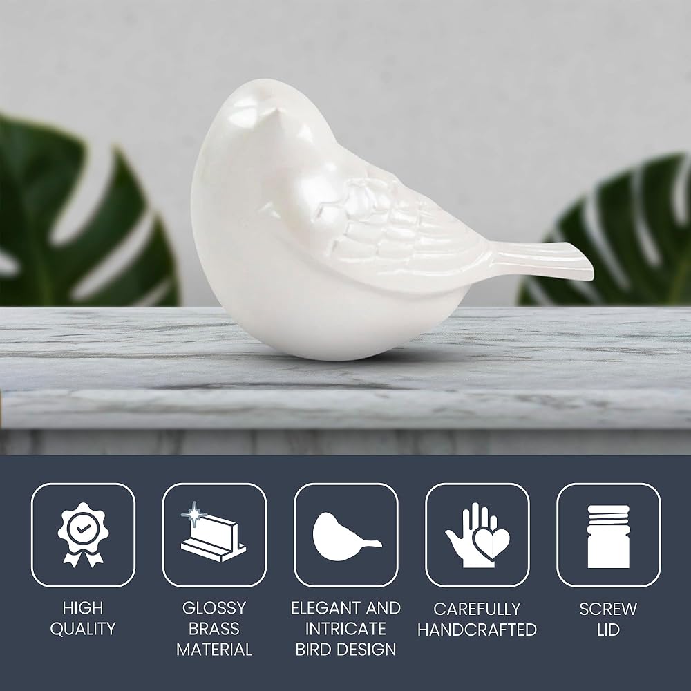 Glossy Brass Material – The lightweight brass base in our bird shaped mini urn for human ashes includes a glossy pearl white paint finish that delivers a soothing hue