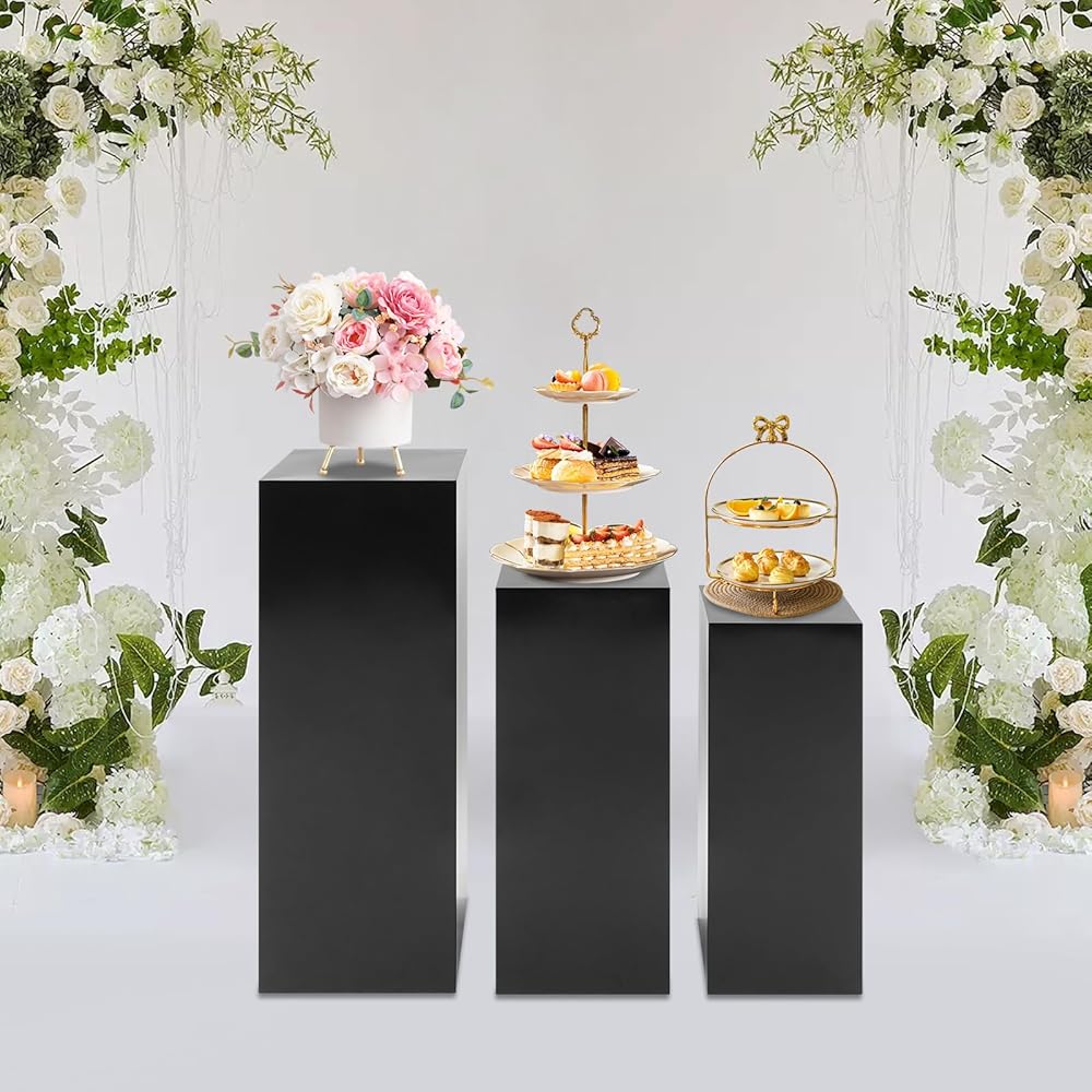حوامل عرض معدنية سوداء، مجموعة مكونة من 3 قطع بتصميم مكعب حديث، أعمدة عرض قائمة بذاتها للحفلات وحفلات الزفاف والمعارض، ارتفاعات 31.5 بوصة و25.59 بوصة و23.62 بوصة