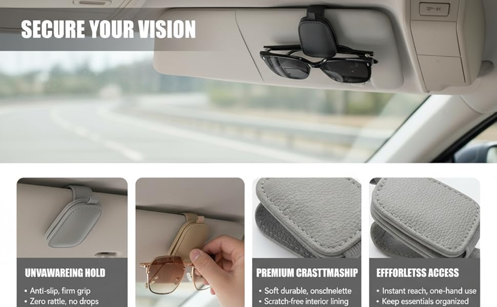 غلاف جلدي كامل سيبقى حاجبك ونظارتك سليمة لأن حامل النظارات الشمسية لواقي السيارة يتكون من جلد عالي الجودة مع ملمس ناعم يغلف المشبك بالكامل