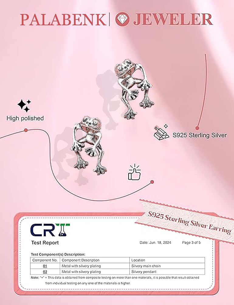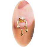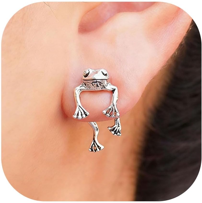FROG EARRINGS DESIGN: Charming silver frog stud earrings featuring detailed animal styling with dangling legs that wrap around your earlobe for a playful, eye-catching look