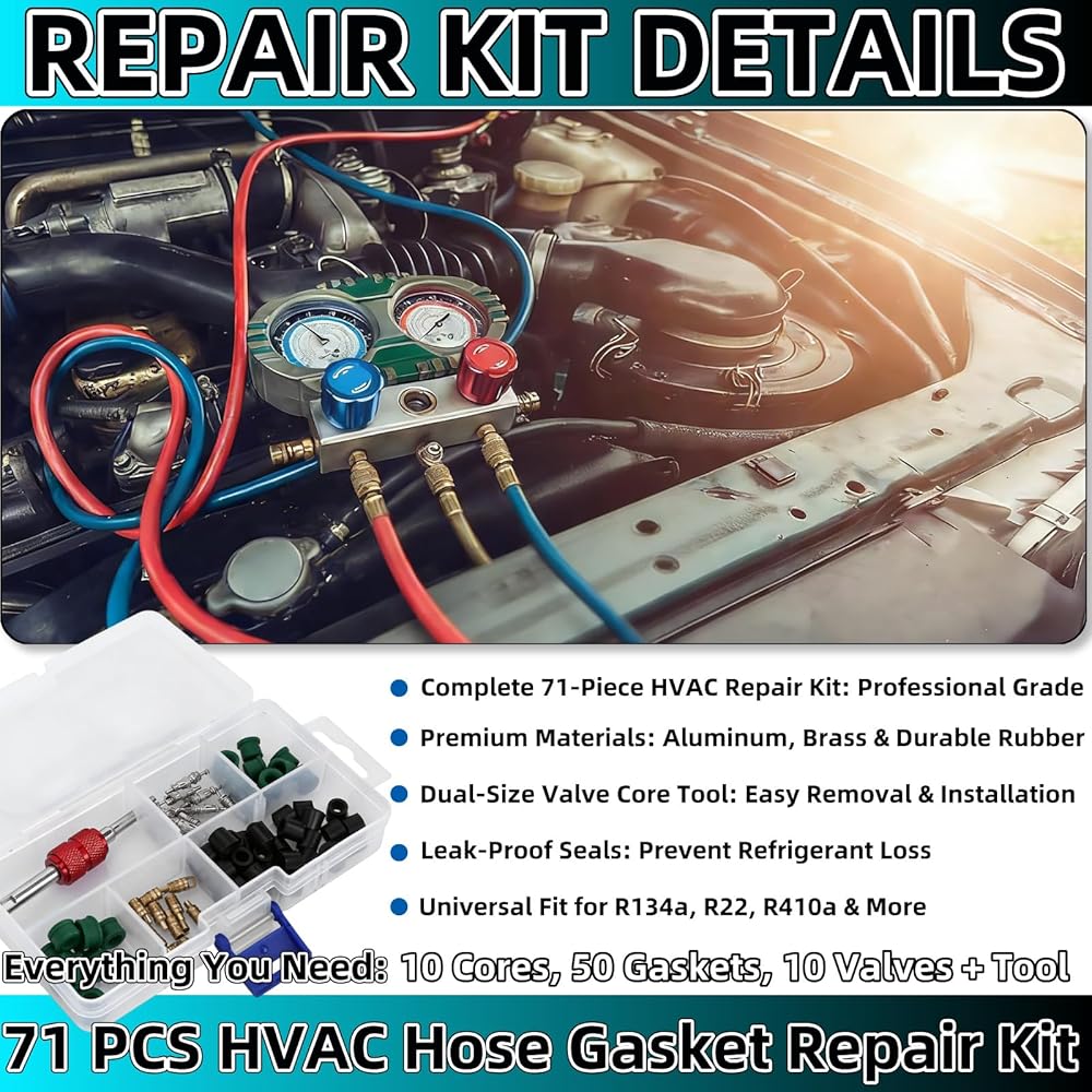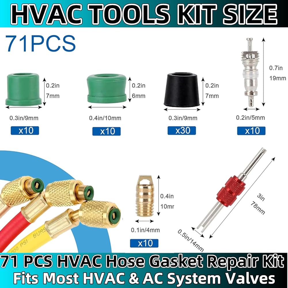 طقم إصلاح مكيف الهواء 71 قطعة، مجموعة حشية خرطوم التدفئة والتهوية وتكييف الهواء ومجموعة أختام خرطوم التدفئة والتهوية وتكييف الهواء، مع أداة إزالة الصمام الأساسية - 50 سدادة مطاطية، 10 صمامات، 10 قلوب صمامات لنظام التيار المتردد للسيارات